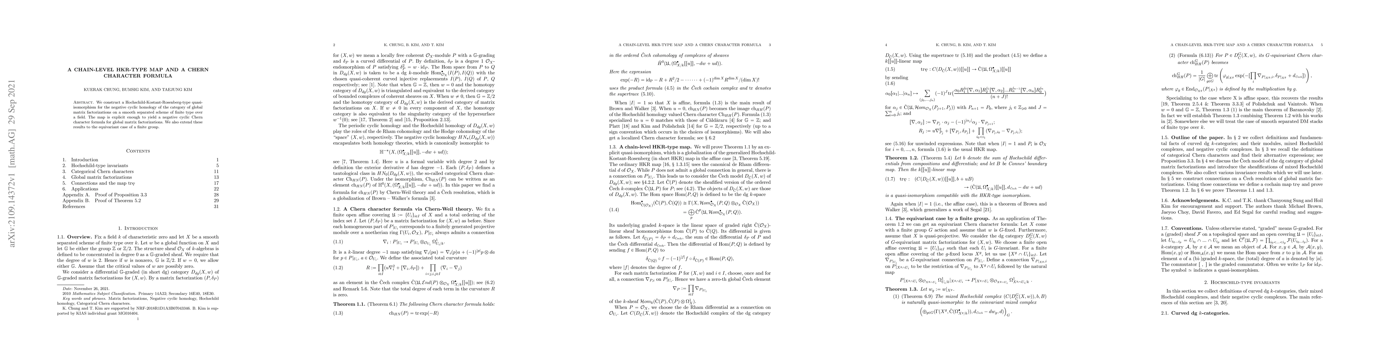 The paper introduces an explicit HKR-type quasi-isomorphism for negative cyclic homology, which facilitates the derivation of a Chern character formula for global matrix factorizations and its equivariant extension.