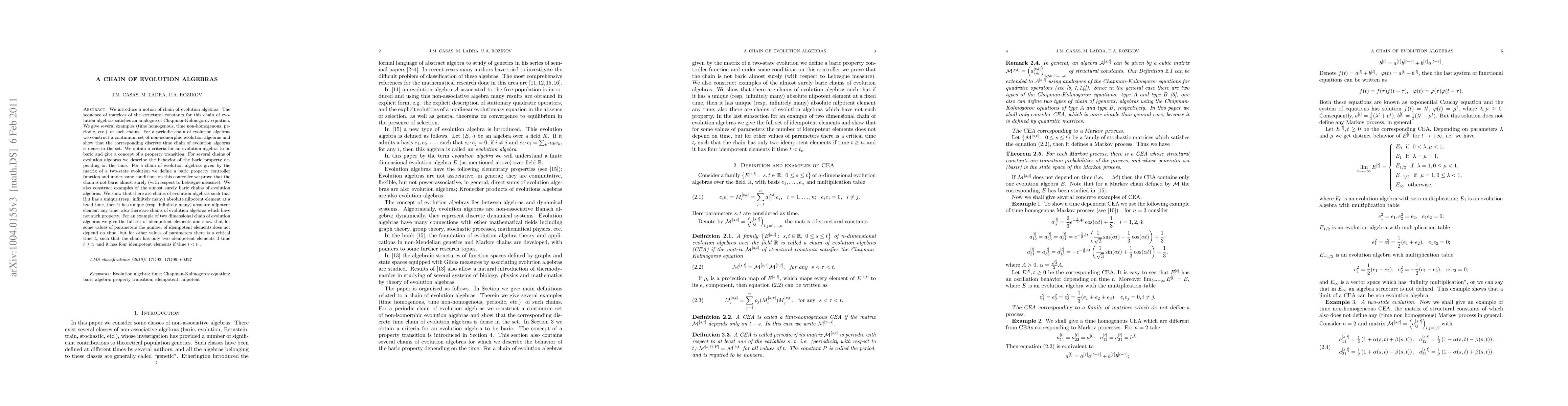 We introduce a notion of chain of evolution algebras. The sequence of matrices of the structural constants for this chain of evolution algebras satisfies an analogue of Chapman-Kolmogorov equation. We give several examples (time homogenous, time non-homogenous, periodic, etc.) of such chains. For a periodic chain of evolution algebras we construct a continuum set of non-isomorphic evolution algebras and show that the corresponding discrete time chain of evolution algebras is dense in the set. We obtain a criteria for an evolution algebra to be baric and give a concept of a property transition. For several chains of evolution algebras we describe the behavior of the baric property depending on the time. For a chain of evolution algebras given by the matrix of a two-state evolution we define a baric property controller function and under some conditions on this controller we prove that the chain is not baric almost surely (with respect to Lebesgue measure). We also construct examples of the almost surely baric chains of evolution algebras. We show that there are chains of evolution algebras such that if it has a unique (resp. infinitely many) absolute nilpotent element at a fixed time, then it has unique (resp. infinitely many) absolute nilpotent element any time; also there are chains of evolution algebras which have not such property. For an example of two dimensional chain of evolution algebras we give the full set of idempotent elements and show that for some values of parameters the number of idempotent elements does not depend on time, but for other values of parameters there is a critical time $t_{c}$ such that the chain has only two idempotent elements if time $t\geq t_{\rm c}$ and it has four idempotent elements if time $t< t_{\rm c}$