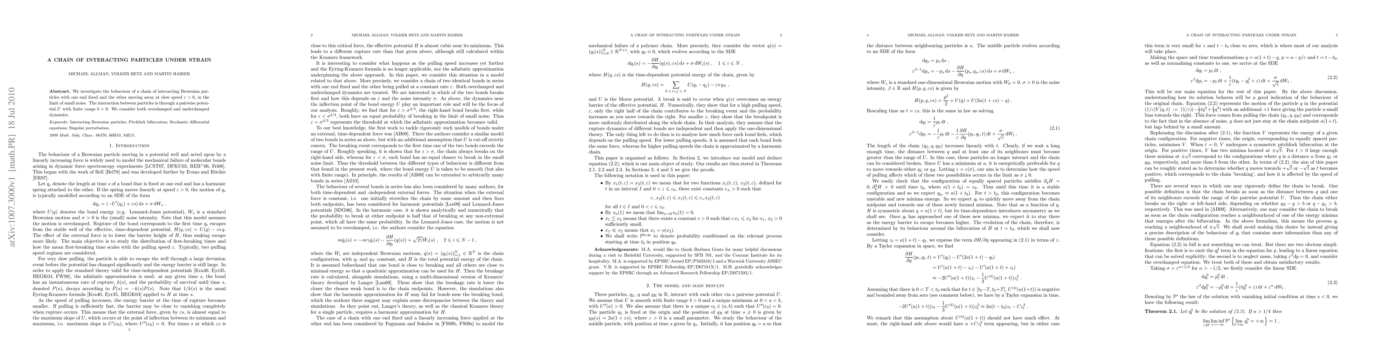 We investigate the behaviour of a chain of interacting Brownian particles with one end fixed and the other moving away at slow speed, in the limit of small noise. The interaction between particles is through a pairwise potential with finite range. We consider both overdamped and underdamped dynamics.