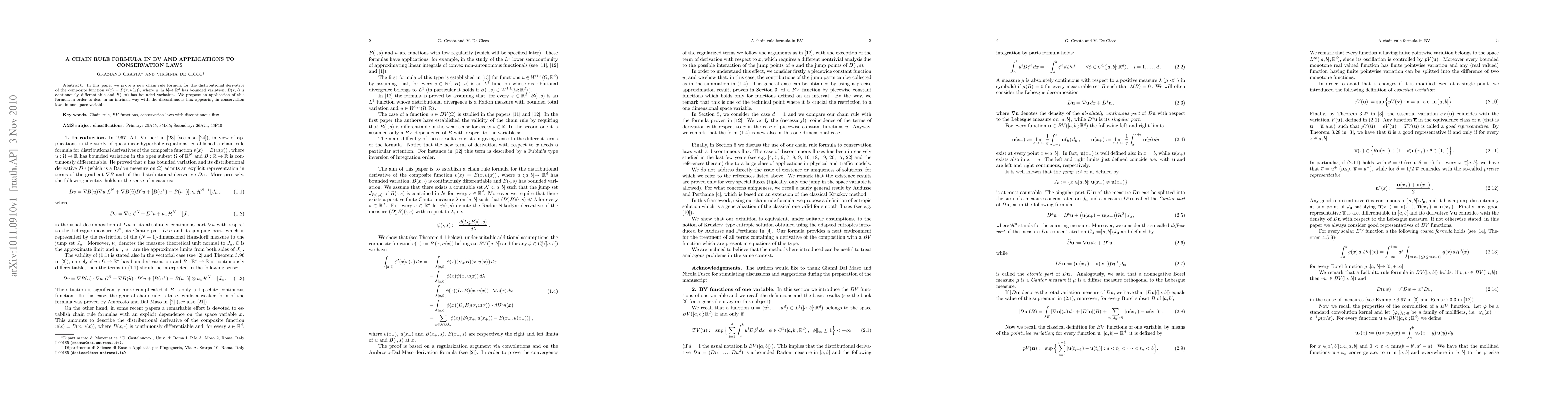 In this paper we prove a new chain rule formula for the distributional derivative of the composite function $v(x)=B(x,u(x))$, where $u:]a,b[\to\R^d$ has bounded variation, $B(x,\cdot)$ is continuously differentiable and $B(\cdot,u)$ has bounded variation. We propose an application of this formula in order to deal in an intrinsic way with the discontinuous flux appearing in conservation laws in one space variable.