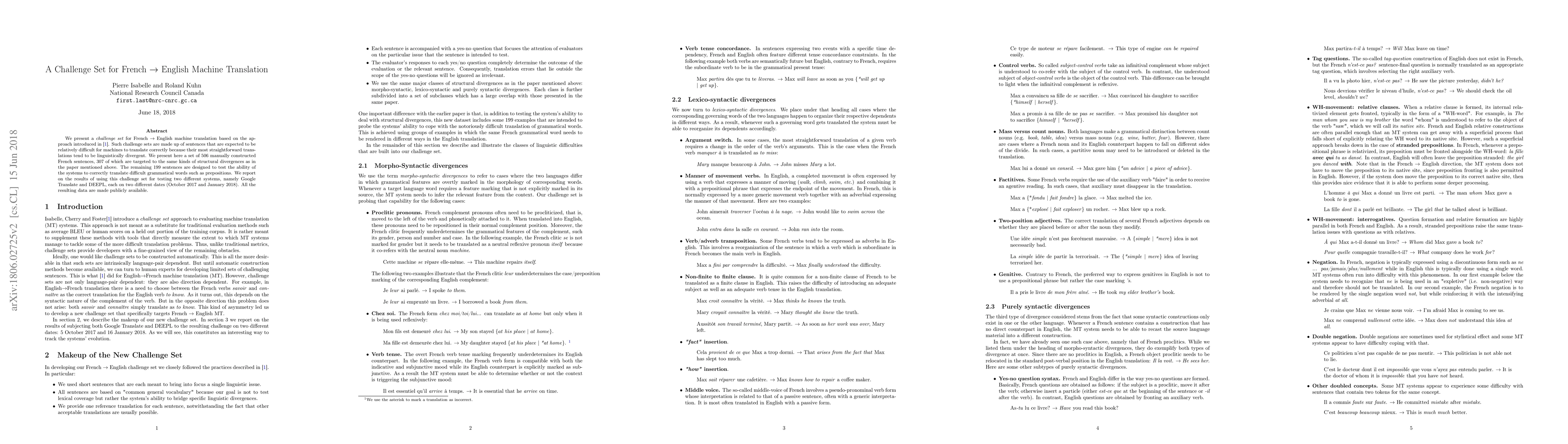 A challenge set for French-to-English machine translation was created to test systems like Google Translate and DEEPL on difficult sentences, with results made publicly available. The study aimed to evaluate the performance of these systems in translating grammatically complex sentences.