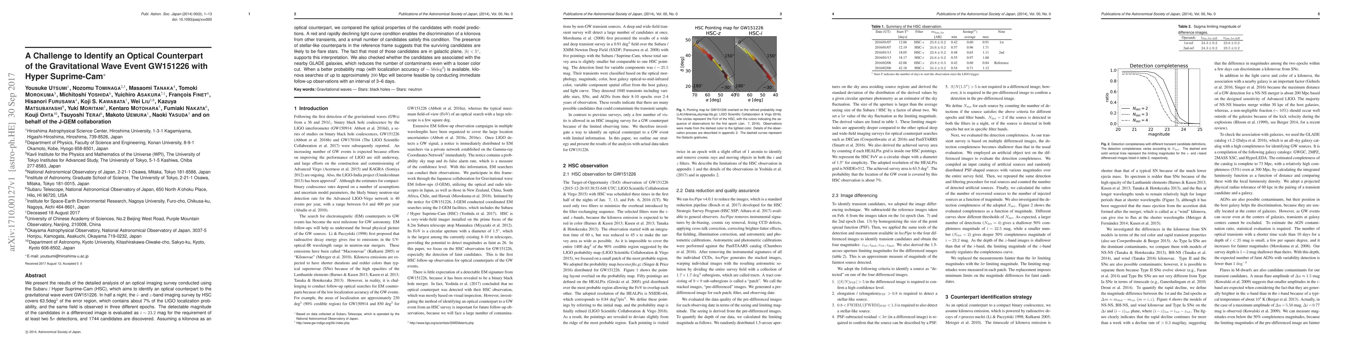 This paper reports an optical imaging survey using the Hyper Suprime-Cam on the Subaru telescope to identify a counterpart to the gravitational wave event GW151226. Despite discovering 1744 candidates, only a few meet the criteria for a kilonova, suggesting most are likely flare stars, especially those near the galactic plane.