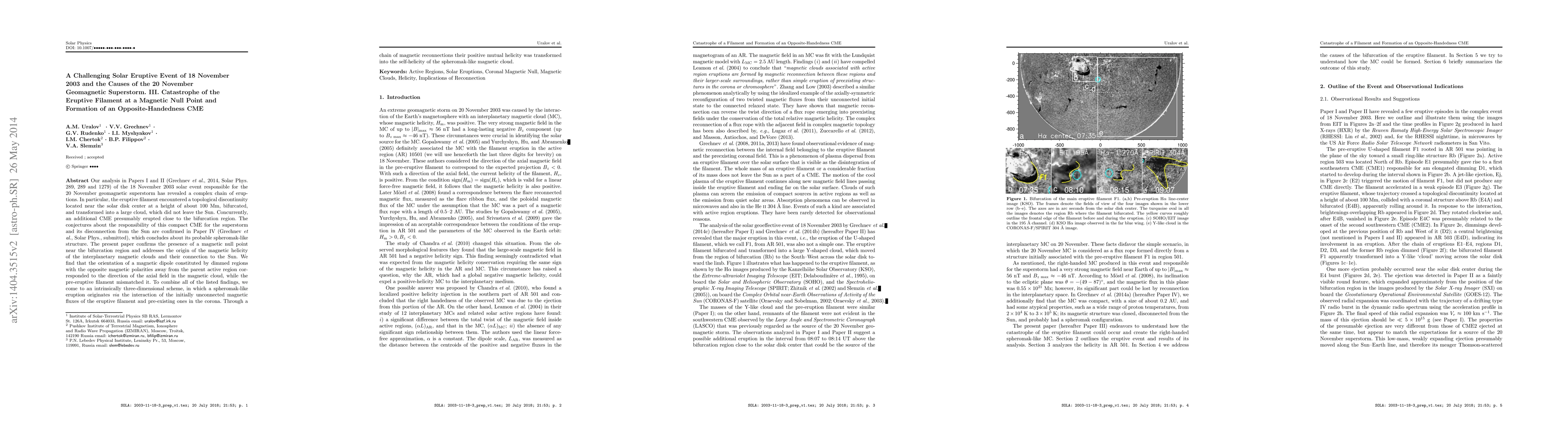 This paper investigates the 18 November 2003 solar event that led to a geomagnetic superstorm, revealing a filament eruption near a magnetic null point that bifurcated and formed a spheromak-like CME. The study concludes that the magnetic helicity of the interplanetary magnetic clouds originated from the interaction of unconnected magnetic fields, leading to a complex three-dimensional eruption mechanism.