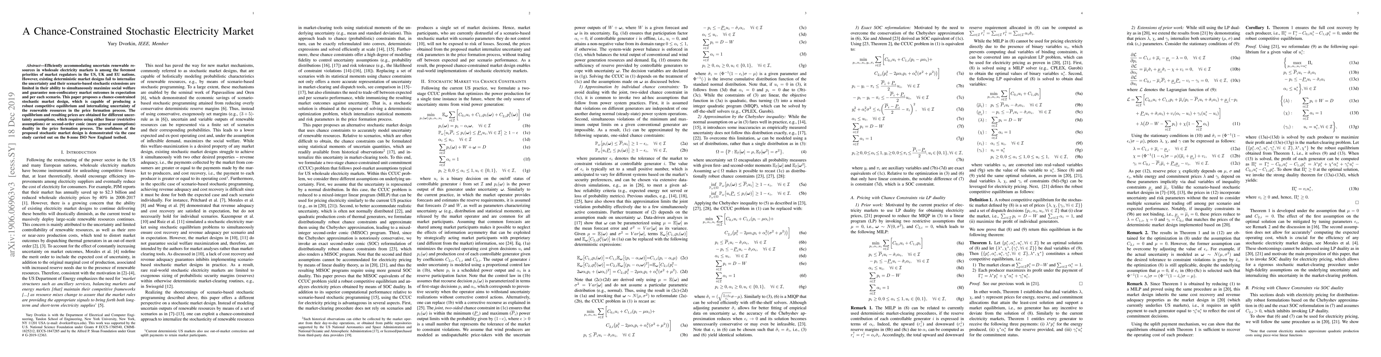This paper proposes a chance-constrained stochastic market design to efficiently accommodate uncertain renewable resources in electricity markets, ensuring robust competitive equilibrium while internalizing uncertainty. The method uses linear or second-order conic duality for price formation, demonstrated via a case study on the 8-zone ISO New England testbed.