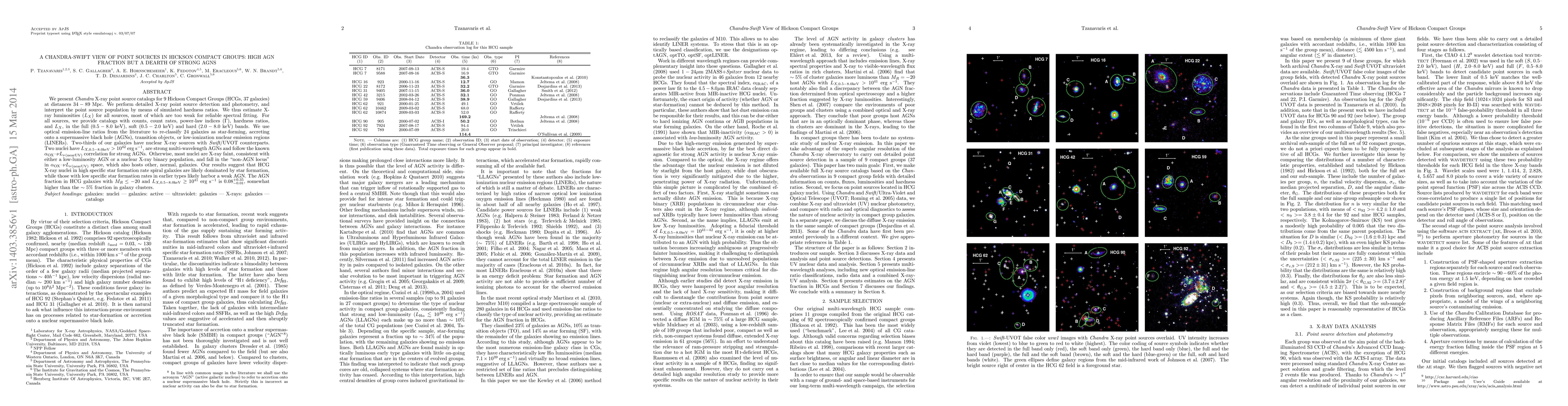 We present $Chandra$ X-ray point source catalogs for 9 Hickson Compact Groups (HCGs, 37 galaxies) at distances $34 - 89$ Mpc. We perform detailed X-ray point source detection and photometry, and interpret the point source population by means of simulated hardness ratios. We thus estimate X-ray luminosities ($L_X$) for all sources, most of which are too weak for reliable spectral fitting. For all sources, we provide catalogs with counts, count rates, power-law indices ($\Gamma$), hardness ratios, and $L_X$, in the full ($0.5-8.0$ keV), soft ($0.5-2.0$ keV) and hard ($2.0-8.0$ keV) bands. We use optical emission-line ratios from the literature to re-classify 24 galaxies as star-forming, accreting onto a supermassive black hole (AGNs), transition objects, or low-ionization nuclear emission regions (LINERs). Two-thirds of our galaxies have nuclear X-ray sources with $Swift$/UVOT counterparts. Two nuclei have $L_{X,{\rm 0.5-8.0 keV}}$~$ > 10^{42}$ erg s$^{-1}$, are strong multi-wavelength AGNs and follow the known $\alpha_{\rm OX}-\nu L_{\nu,\rm near UV}$ correlation for strong AGNs. Otherwise, most nuclei are X-ray faint, consistent with either a low-luminosity AGN or a nuclear X-ray binary population, and fall in the "non-AGN locus" in $\alpha_{\rm OX}-\nu L_{\nu,\rm near UV}$ space, which also hosts other, normal, galaxies. Our results suggest that HCG X-ray nuclei in high specific star formation rate spiral galaxies are likely dominated by star formation, while those with low specific star formation rates in earlier types likely harbor a weak AGN. The AGN fraction in HCG galaxies with $M_R \le -20$ and $L_{X,{\rm 0.5-8.0 keV}} \ge 10^{41}$ erg s$^{-1}$ is $0.08^{+0.35}_{-0.01}$, somewhat higher than the $\sim 5%$ fraction in galaxy clusters.