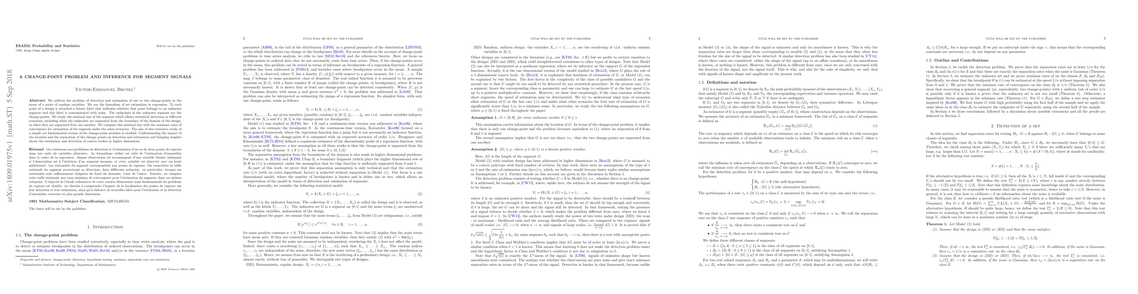 The paper addresses the problem of detecting and estimating one or two change-points in the mean of a series of random variables using set estimation in regression. It examines the minimal segment size for statistical detection in various scenarios, comparing it with minimax rates of convergence for segment estimation.