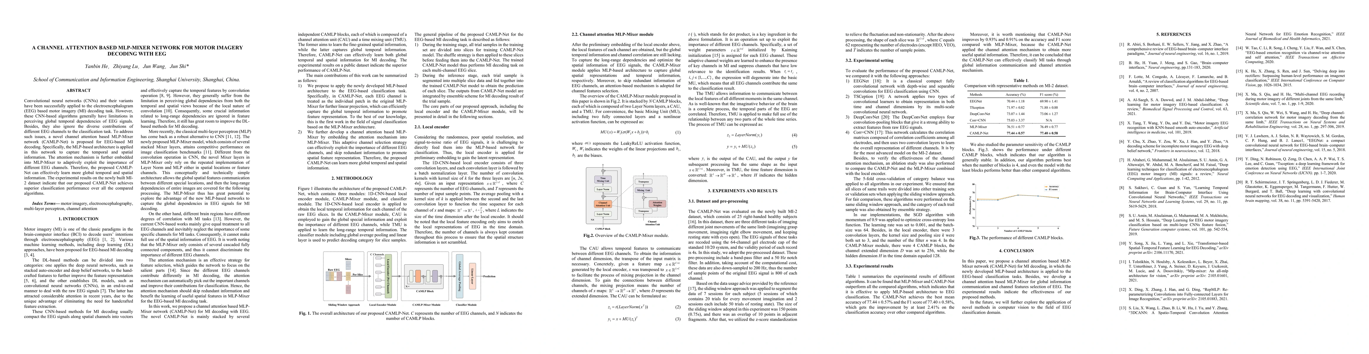 The paper proposes a novel channel attention based MLP-Mixer network (CAMLP-Net) for EEG-based motor imagery decoding, which utilizes MLP architecture to capture temporal and spatial information and incorporates an attention mechanism to emphasize important EEG channels, achieving superior classification performance over existing methods.