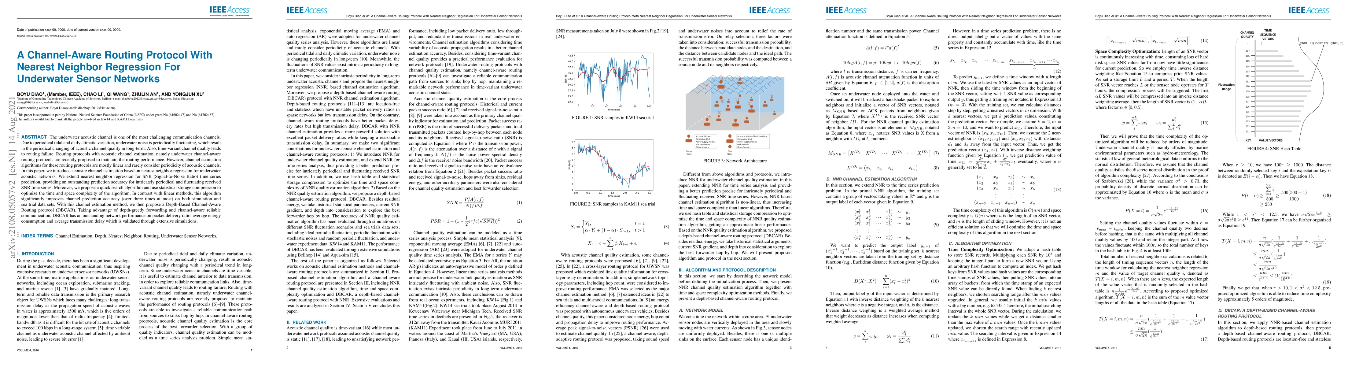 This paper proposes a channel-aware routing protocol for underwater sensor networks using nearest neighbor regression for improved acoustic channel estimation. The method significantly enhances channel prediction accuracy and optimizes routing performance through depth-greedy forwarding and reliable communication.