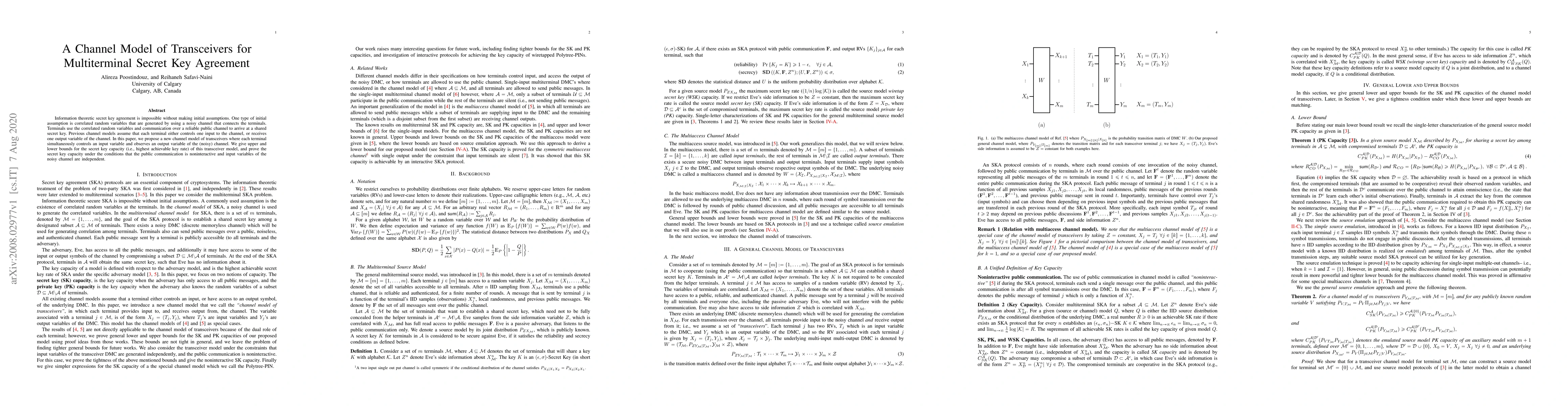Information theoretic secret key agreement is impossible without making initial assumptions. One type of initial assumption is correlated random variables that are generated by using a noisy channel that connects the terminals. Terminals use the correlated random variables and communication over a reliable public channel to arrive at a shared secret key. Previous channel models assume that each terminal either controls one input to the channel, or receives one output variable of the channel. In this paper, we propose a new channel model of transceivers where each terminal simultaneously controls an input variable and observes an output variable of the (noisy) channel. We give upper and lower bounds for the secret key capacity (i.e., highest achievable key rate) of this transceiver model, and prove the secret key capacity under the conditions that the public communication is noninteractive and input variables of the noisy channel are independent.