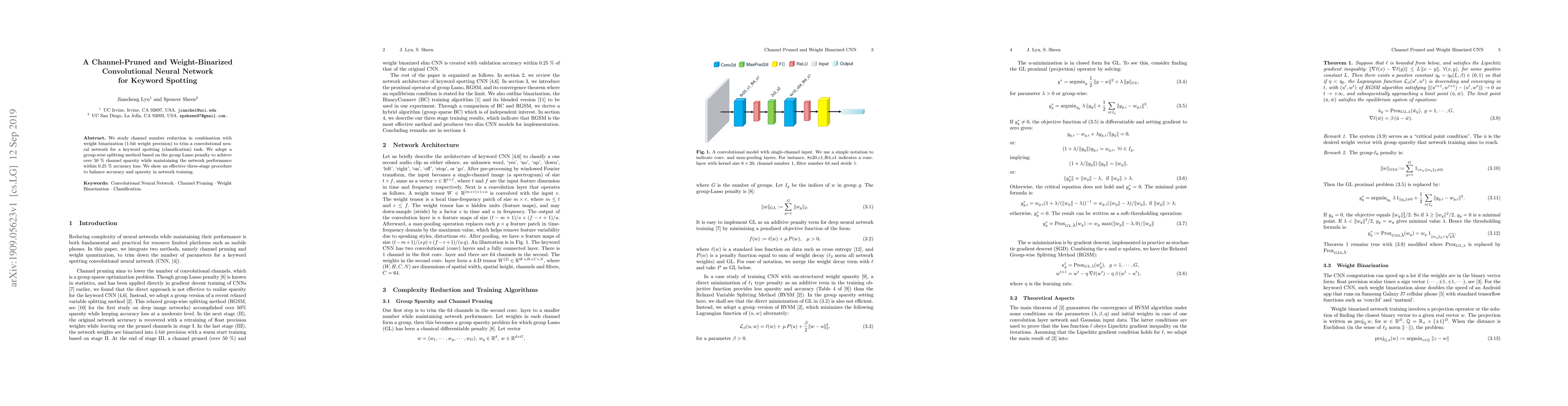 We study channel number reduction in combination with weight binarization (1-bit weight precision) to trim a convolutional neural network for a keyword spotting (classification) task. We adopt a group-wise splitting method based on the group Lasso penalty to achieve over 50% channel sparsity while maintaining the network performance within 0.25% accuracy loss. We show an effective three-stage procedure to balance accuracy and sparsity in network training.