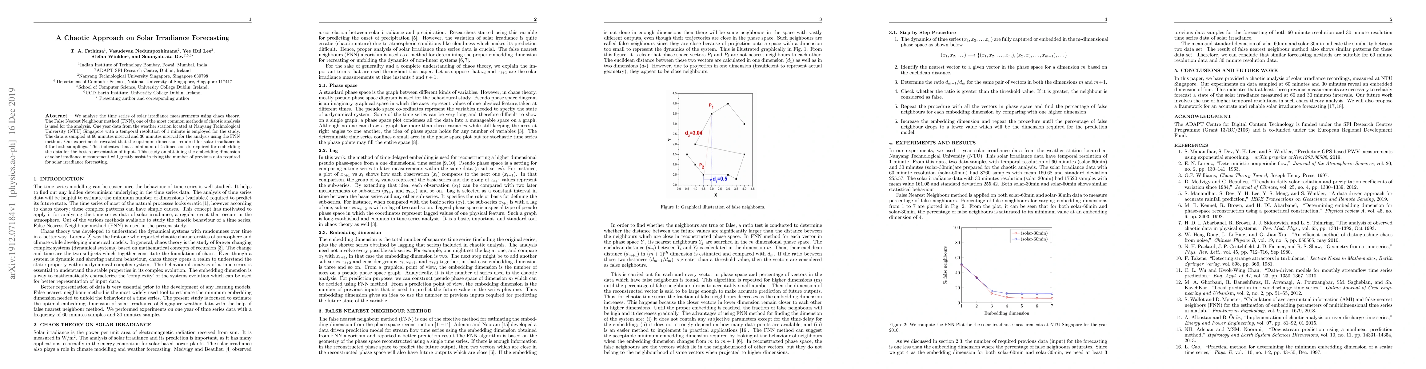 This study applies chaos theory, specifically the False Nearest Neighbour method, to analyze solar irradiance measurements from NTU Singapore. Results indicate that a minimum embedding dimension of 4 is optimal for both 60-minute and 30-minute sampled data, aiding in determining the necessary historical data for accurate forecasting.