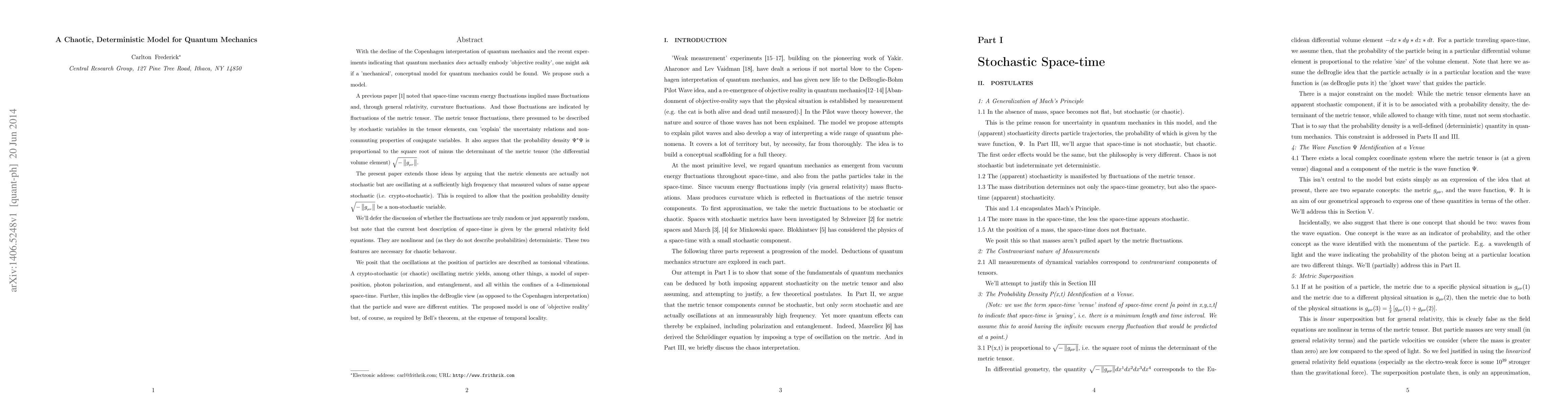 With the decline of the Copenhagen interpretation of quantum mechanics and the recent experiments indicating that quantum mechanics does actually embody 'objective reality', one might ask if a 'mechanical', conceptual model for quantum mechanics could be found. We propose such a model. Vacuum energy fluctuations imply mass fluctuations and, through general relativity, curvature fluctuations. And those fluctuations are indicated by fluctuations of the metric tensor. The metric tensor fluctuations can 'explain' the uncertainty relations and non-commuting properties of conjugate variables. We argue that that the probability density is proportional to the square root of minus the determinant of the metric tensor (the differential volume element). We argue that the metric elements are not stochastic but are oscillating at a high enough frequency that measured values of same appear stochastic (i.e. crypto-stochastic). We suggest that the oscillations at the position of particles are described as torsional vibrations. A crypto-stochastic (or chaotic) oscillating metric yields, among other things, a model of super-position, photon polarization, and entanglement, and all within the confines of a 4-dimensional space-time.
