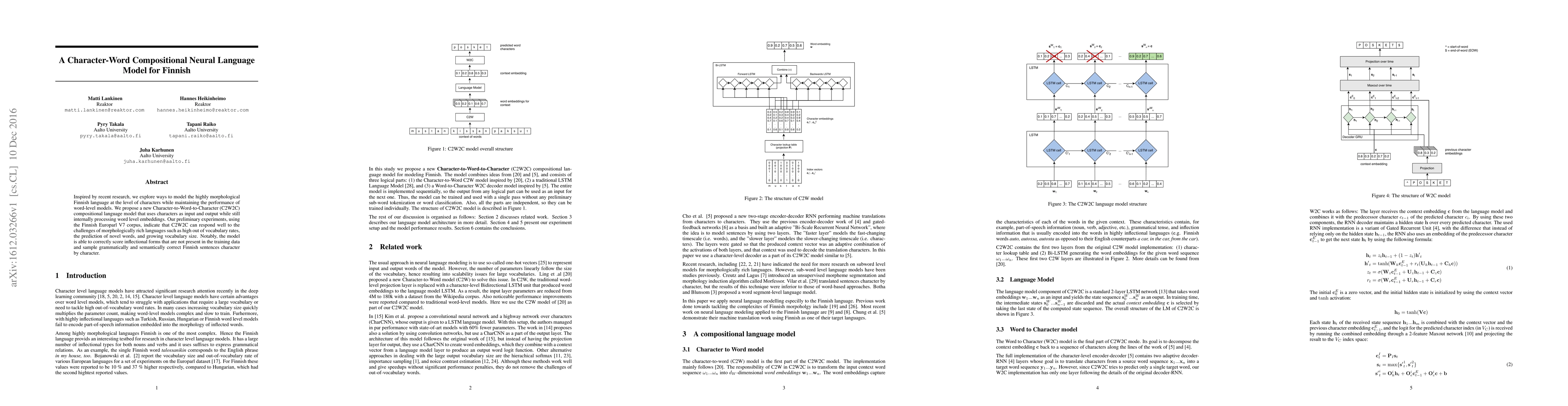 Inspired by recent research, we explore ways to model the highly morphological Finnish language at the level of characters while maintaining the performance of word-level models. We propose a new Character-to-Word-to-Character (C2W2C) compositional language model that uses characters as input and output while still internally processing word level embeddings. Our preliminary experiments, using the Finnish Europarl V7 corpus, indicate that C2W2C can respond well to the challenges of morphologically rich languages such as high out of vocabulary rates, the prediction of novel words, and growing vocabulary size. Notably, the model is able to correctly score inflectional forms that are not present in the training data and sample grammatically and semantically correct Finnish sentences character by character.