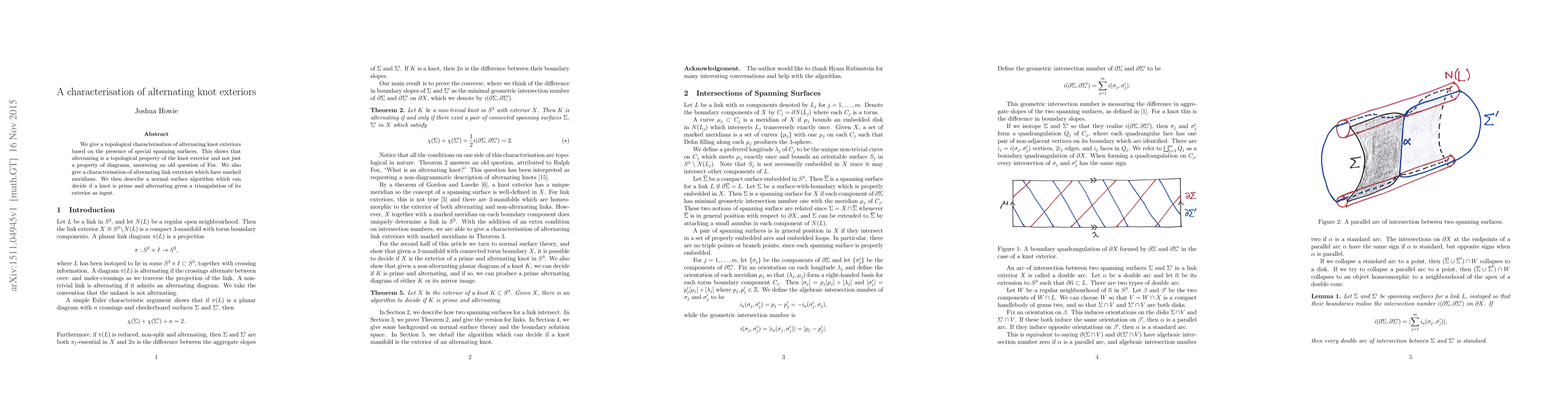Researchers provide a topological characterization of alternating knot exteriors, showing it's a property inherent to the exterior itself, not just its diagram form. They also develop an algorithm to determine if a knot is prime and alternating given its exterior triangulation.