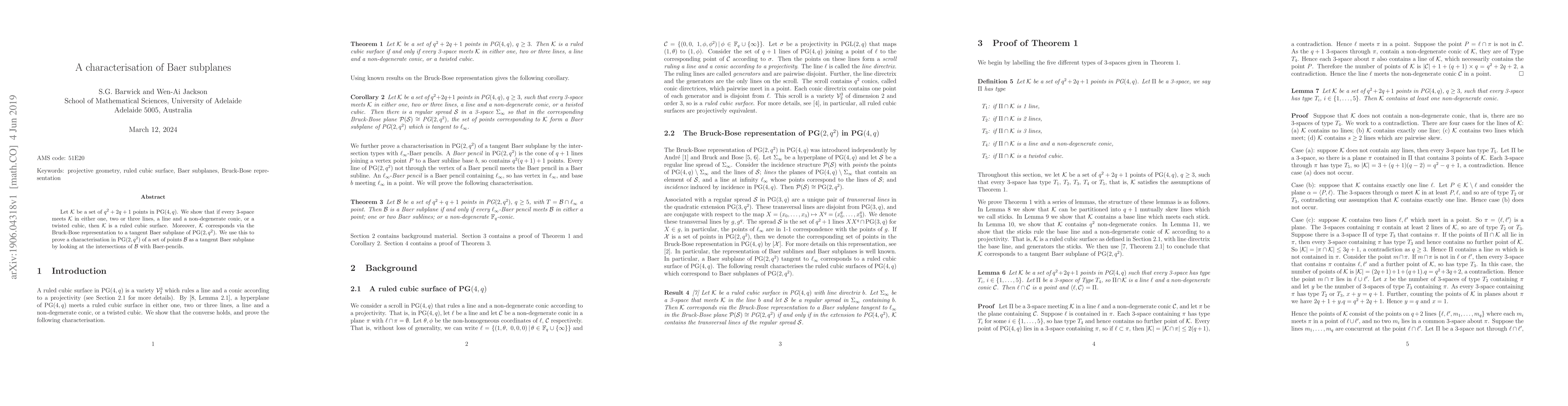Let $K$ be a set of $q^2+2q+1$ points in $PG(4,q)$. We show that if every 3-space meets $K$ in either one, two or three lines, a line and a non-degenerate conic, or a twisted cubic, then $K$ is a ruled cubic surface. Moreover, $K$ corresponds via the Bruck-Bose representation to a tangent Baer subplane of $PG(2,q^2)$. We use this to prove a characterisation in $PG(2,q^2)$ of a set of points $B$ as a tangent Baer subplane by looking at the intersections of $B$ with Baer-pencils.