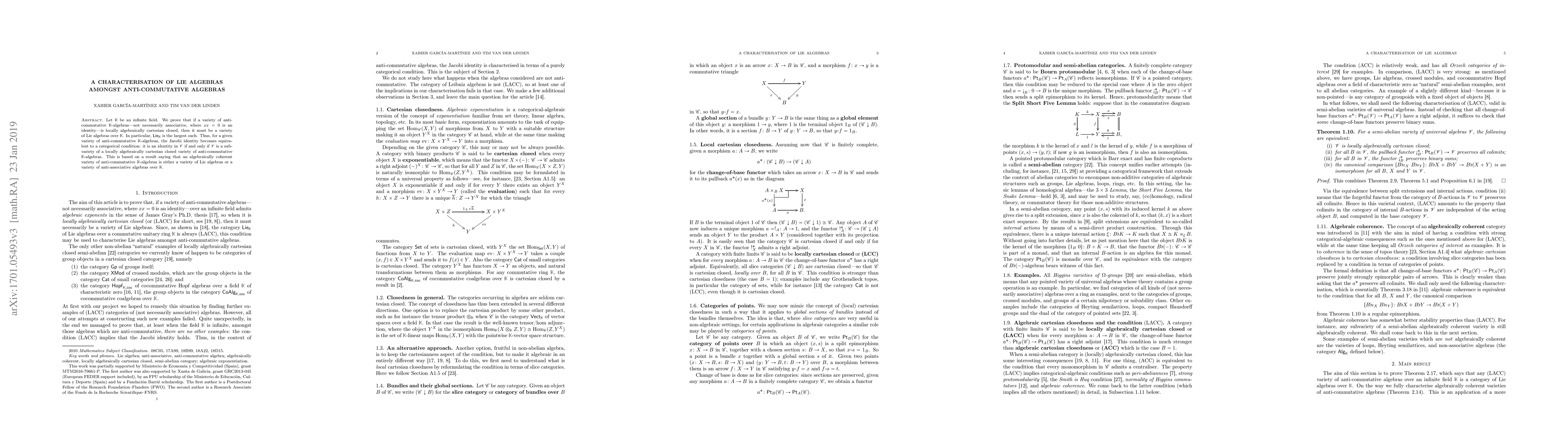 A research paper shows that if a variety of anti-commutative algebras over an infinite field is locally algebraically cartesian closed, it must be a variety of Lie algebras. This implies the Jacobi identity becomes equivalent to a categorical condition: being a subvariety of a specific type of anti-commutative algebra.