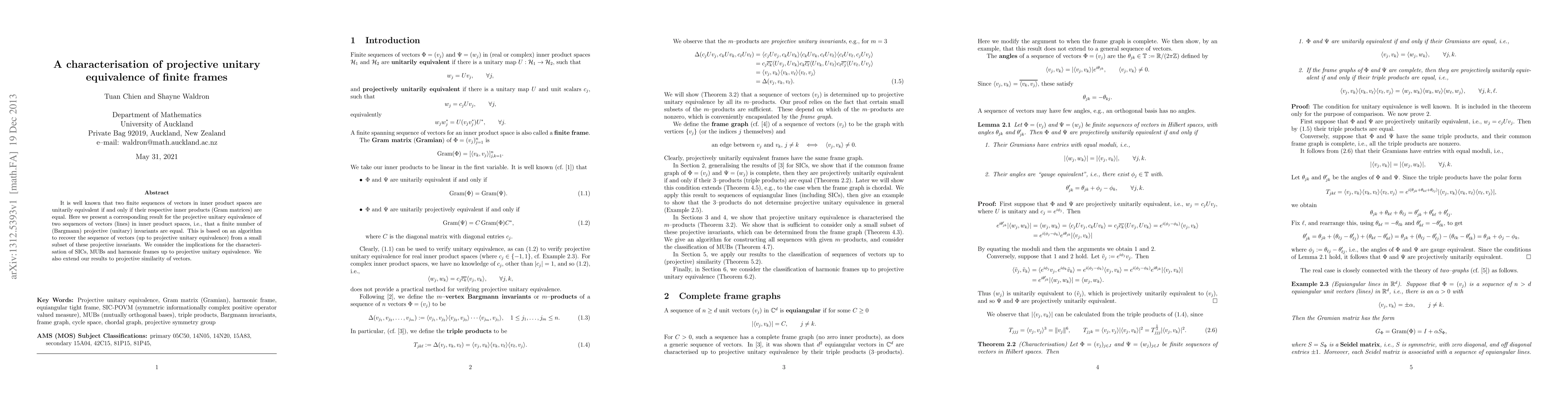 Two finite sequences of vectors in inner product spaces are projectively unitarily equivalent if their respective projective unitary invariants are equal. This result implies new characterisations for specific types of frames.