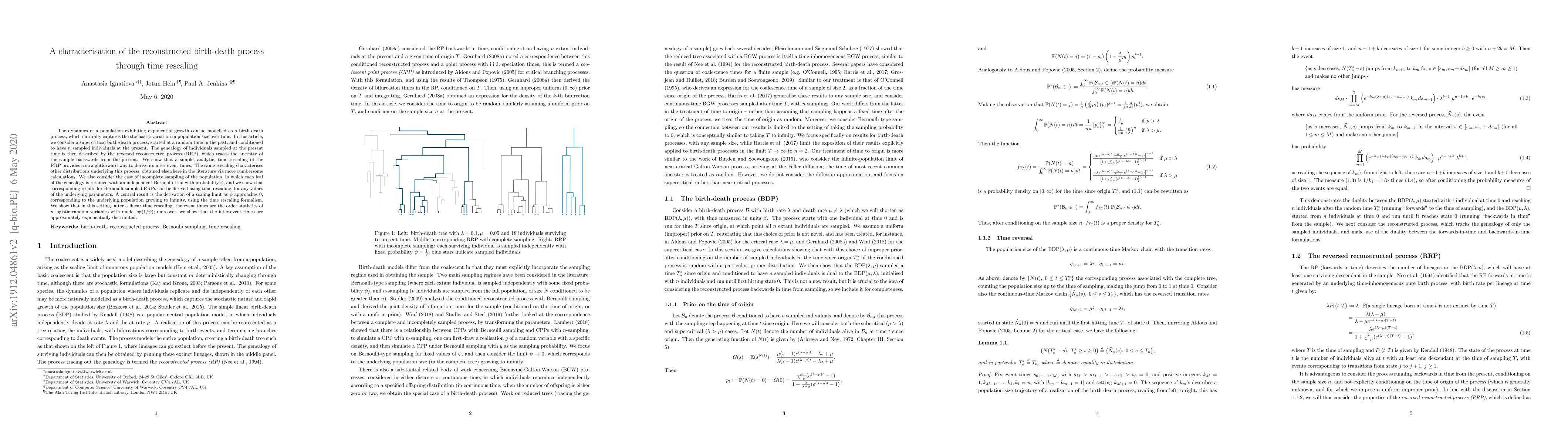 This paper characterizes the reversed reconstructed birth-death process through time rescaling, showing that it simplifies the derivation of inter-event times and other distributions. It also extends the analysis to Bernoulli-sampled processes and derives a scaling limit for incomplete sampling, revealing that event times become order statistics of logistic random variables.
