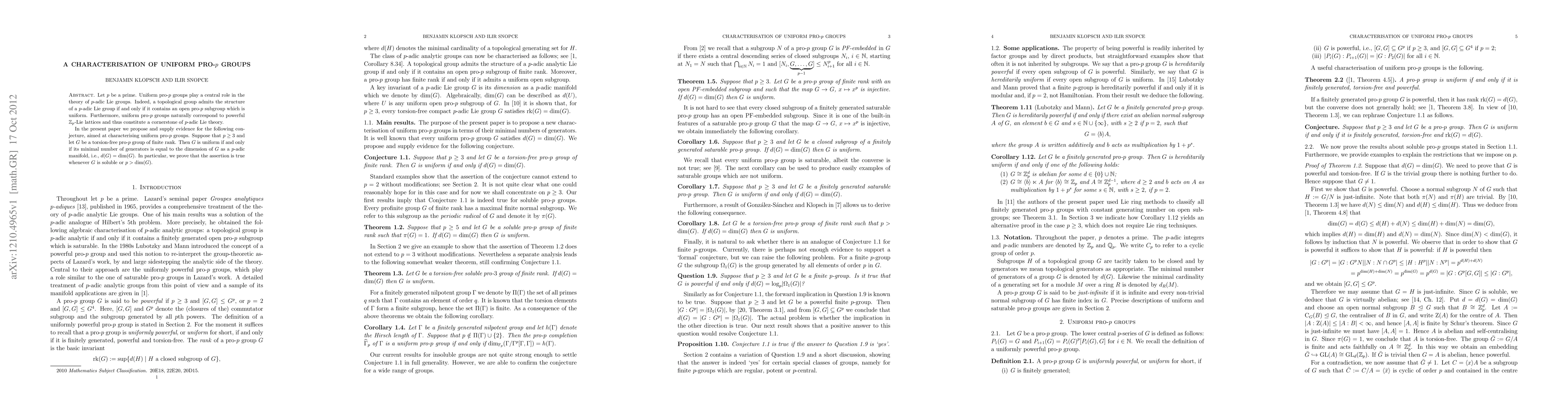 This paper proposes a conjecture characterizing uniform pro-p groups, suggesting that a torsion-free pro-p group of finite rank is uniform if its minimal number of generators equals its dimension as a p-adic manifold. The conjecture is proven true for soluble groups or when the prime p exceeds the group's dimension.