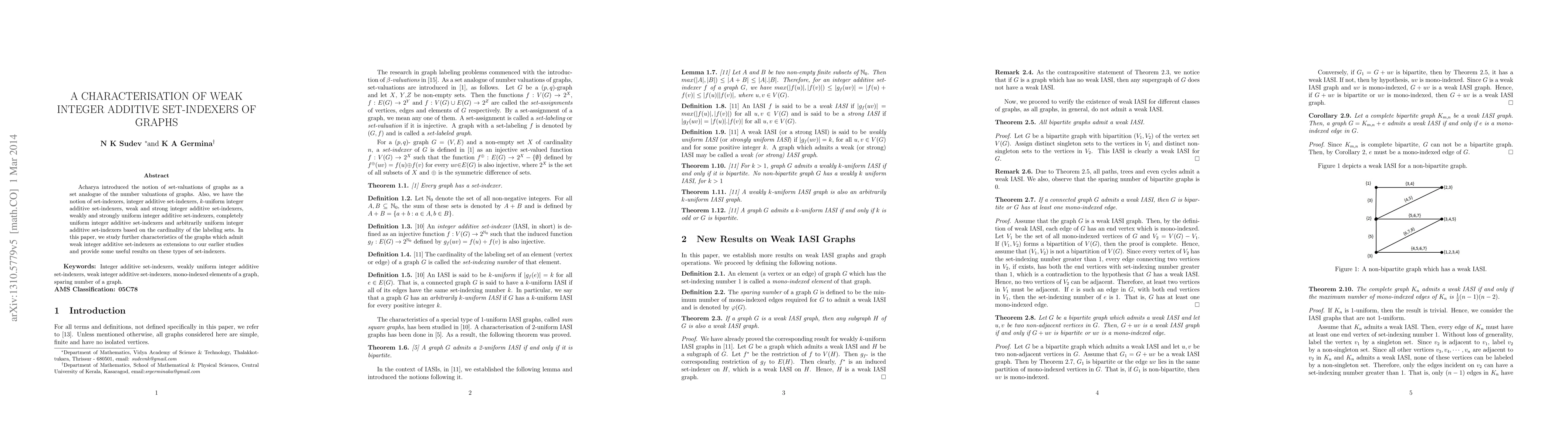 An integer additive set-indexer is defined as an injective function $f:V(G)\rightarrow 2^{\mathbb{N}_0}$ such that the induced function $g_f:E(G) \rightarrow 2^{\mathbb{N}_0}$ defined by $g_f (uv) = f(u)+ f(v)$ is also injective. An integer additive set-indexer is said to be $k$-uniform if $|g_f(e)| = k$ for all $e\in E(G)$. An integer additive set-indexer $f$ is said to be a weak integer additive set-indexer if $|g_f(uv)|=max(|f(u)|,|f(v)|)$ for all $u,v\in V(G)$. In this paper, we study the characteristics of certain graphs and graph classes which admit weak integer additive set-indexers.