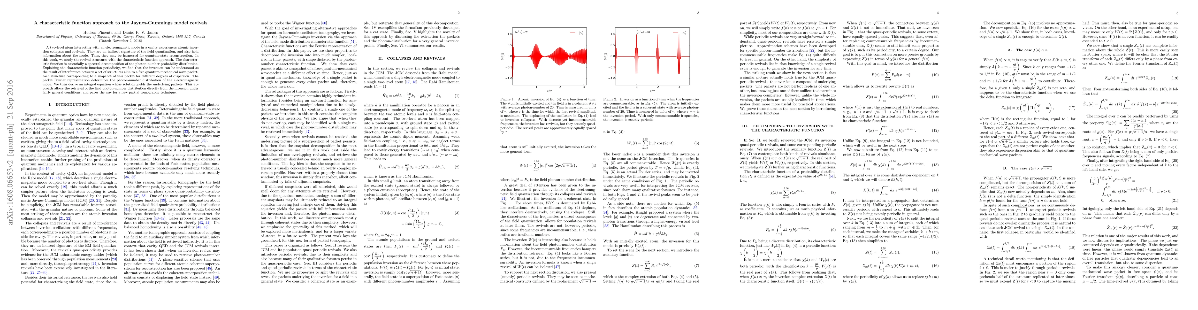 A two-level atom interacting with an electromagnetic mode in a cavity experiences population collapses and revivals. They are an indirect signature of the field quantization, and also hold information about the mode. Thus, they may be harnessed for quantum-state reconstruction. In this work, we study the revival structures with the characteristic function approach. The characteristic function is essentially a spectral decomposition of the photon-number probability distribution. Exploiting the characteristic function periodicity, we find that the atomic population inversion can be understood as the result of interference between a set of structures akin to a free quantum-mechanical wave packet, each structure corresponding to snapshots of this packet for different degrees of dispersion. When these structures do not overlap, each of which can be identified to one of the inversion revivals, in which case we may also retrieve the photon-number distribution.