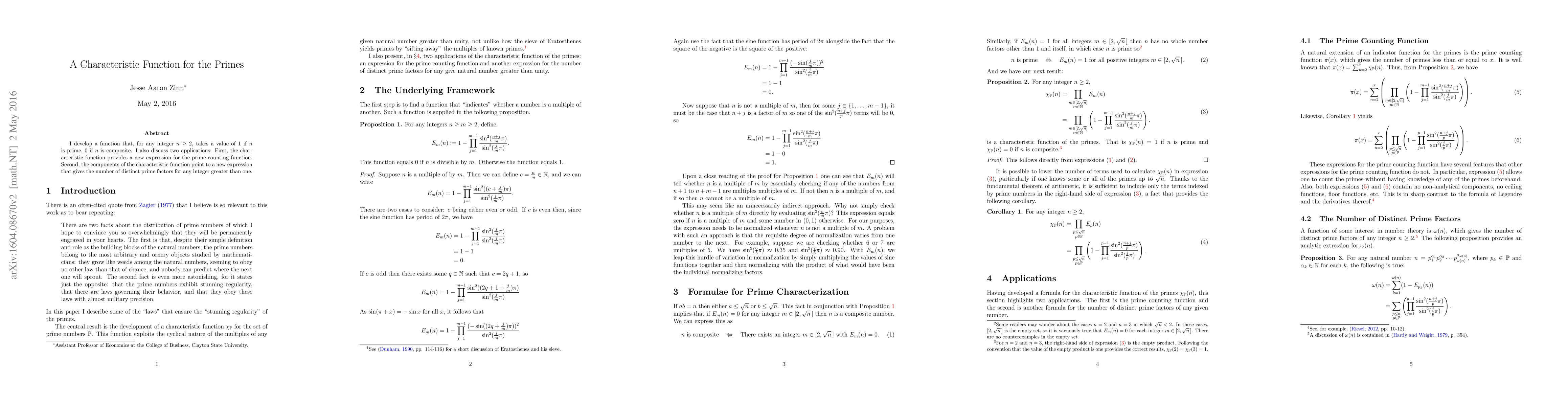 I develop a function that, for any integer $n \geq 2$, takes a value of 1 if $n$ is prime, 0 if $n$ is composite. I also discuss two applications: First, the characteristic function provides a new expression for the prime counting function. Second, the components of the characteristic function point to a new expression that gives the number of distinct prime factors for any integer greater than one.