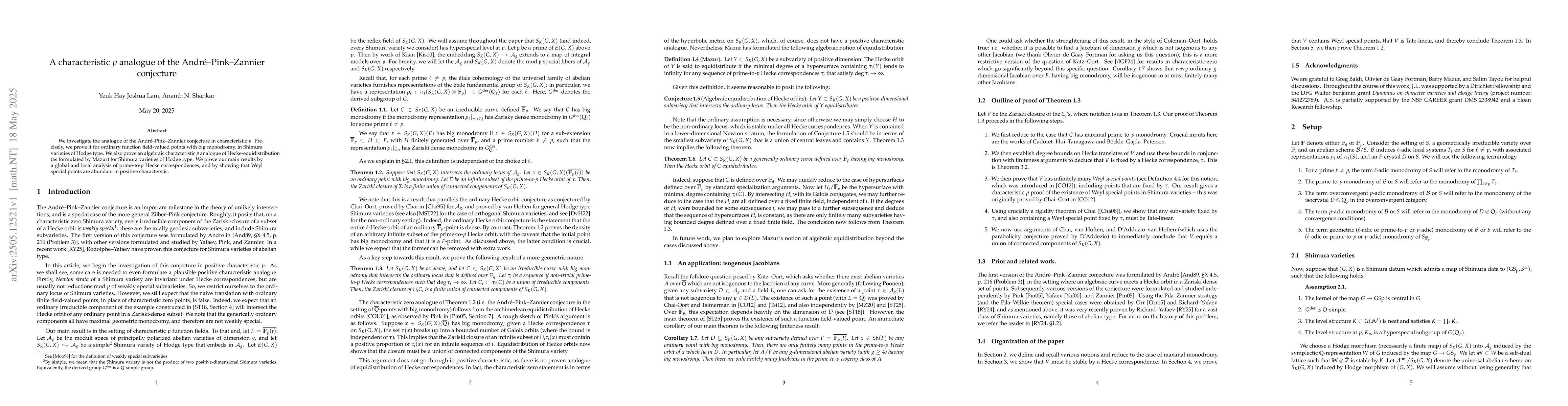 This paper proves two major conjectures in number theory for positive characteristic p, involving Shimura varieties of Hodge type and Weyl special points.