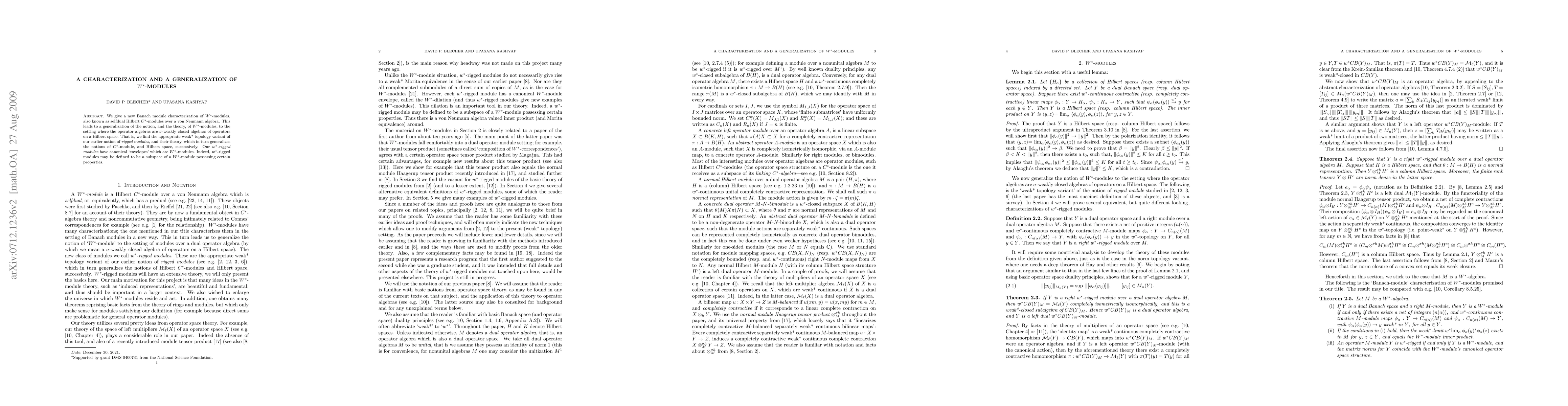 We give a new Banach module characterization of $W^*$-modules, also known as selfdual Hilbert $C^*$-modules over a von Neumann algebra. This leads to a generalization of the notion, and the theory, of W*-modules, to the setting where the operator algebras are $\sigma$-weakly closed algebras of operators on a Hilbert space. That is, we find the appropriate weak* topology variant of our earlier notion of {\em rigged modules}, and their theory, which in turn generalizes the notions of C*-module, and Hilbert space, successively. Our {\em w*-rigged modules} have canonical `envelopes' which are W*-modules. Indeed, w*-rigged modules may be defined to be a subspace of a W*-module possessing certain properties.