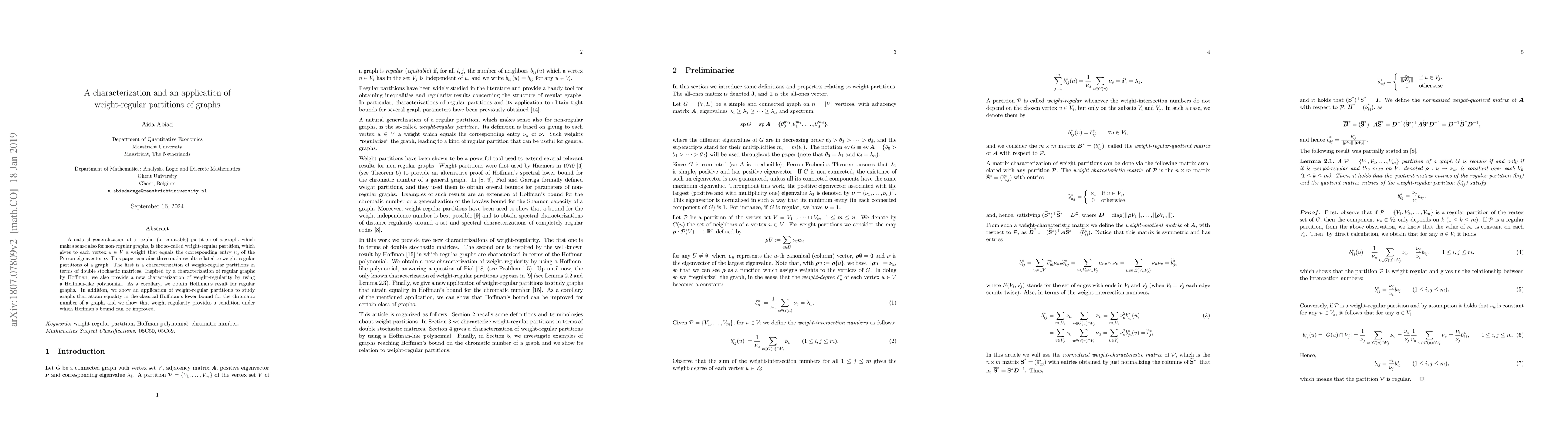This paper characterizes weight-regular partitions of graphs using double stochastic matrices and a Hoffman-like polynomial, and applies this concept to improve Hoffman's lower bound for the chromatic number in certain graphs.