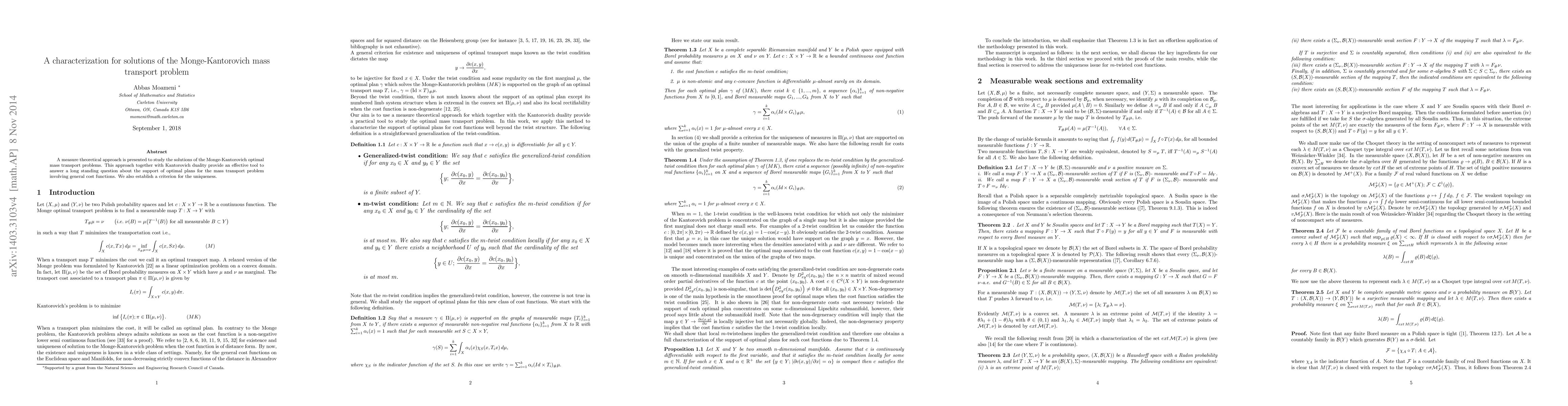 This paper characterizes solutions of the Monge-Kantorovich mass transport problem using a measure theoretical approach and Kantorovich duality, providing insights into the support of optimal plans for general cost functions and establishing a criterion for uniqueness.