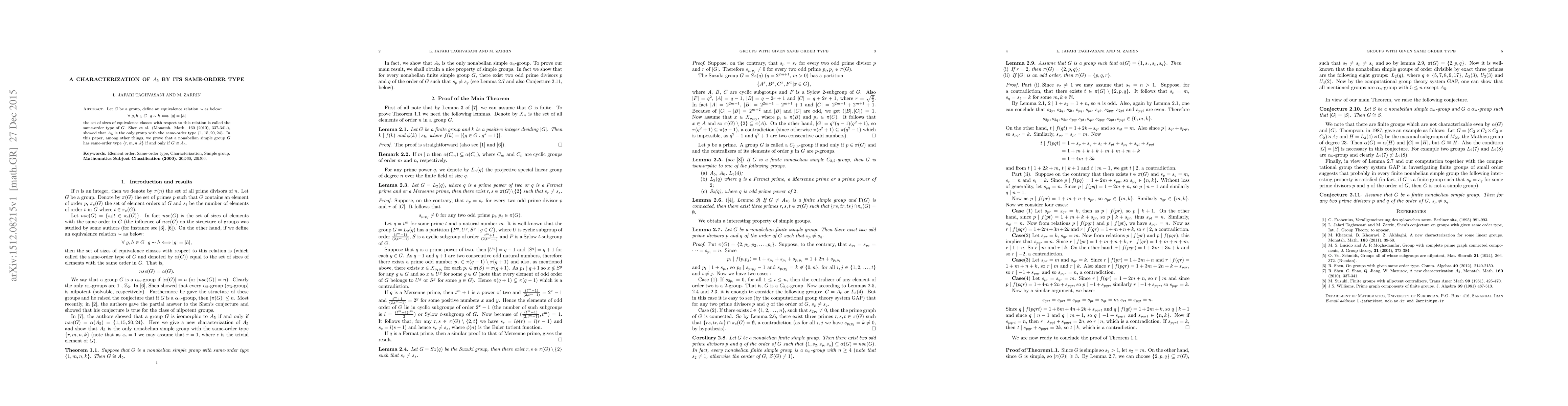 Let G be a group, define an equivalence relation s as below: 8 g; h 2 G g s h () jgj = jhj the set of sizes of equivalence classes with respect to this relation is called the same-order type of G. Shen et al. (Monatsh. Math. 160 (2010), 337-341.), showed that A5 is the only group with the same-order type f1; 15; 20; 24g. In this paper, among other things, we prove that a nonabelian simple group G has same-order type fr; m; n; kg if and only if G ?= A5.