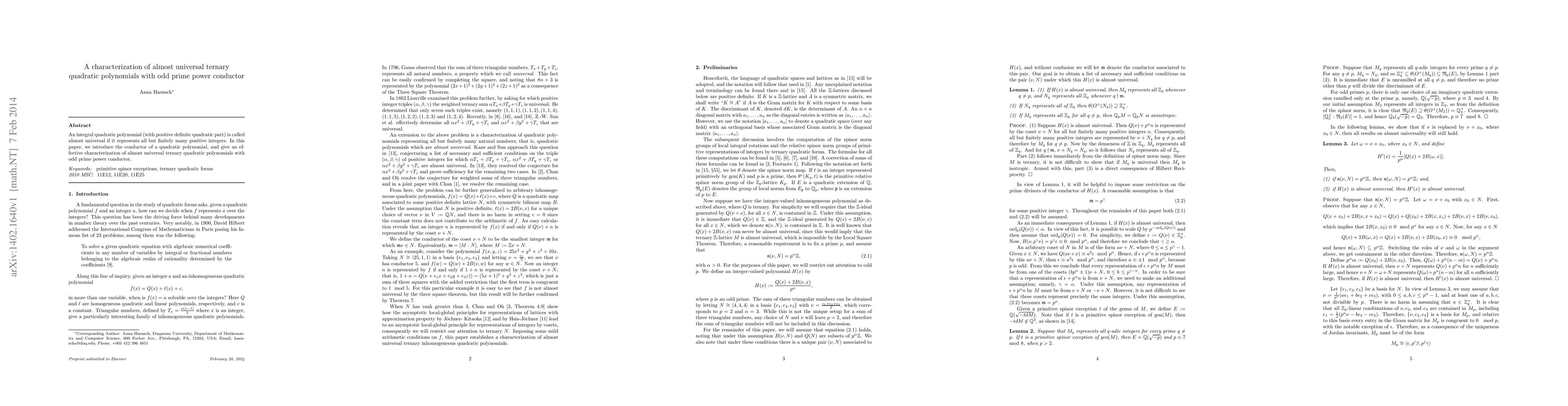 This paper introduces the concept of the conductor for quadratic polynomials and provides an effective characterization of almost universal ternary quadratic polynomials that represent all but finitely many positive integers, specifically focusing on those with an odd prime power as the conductor.