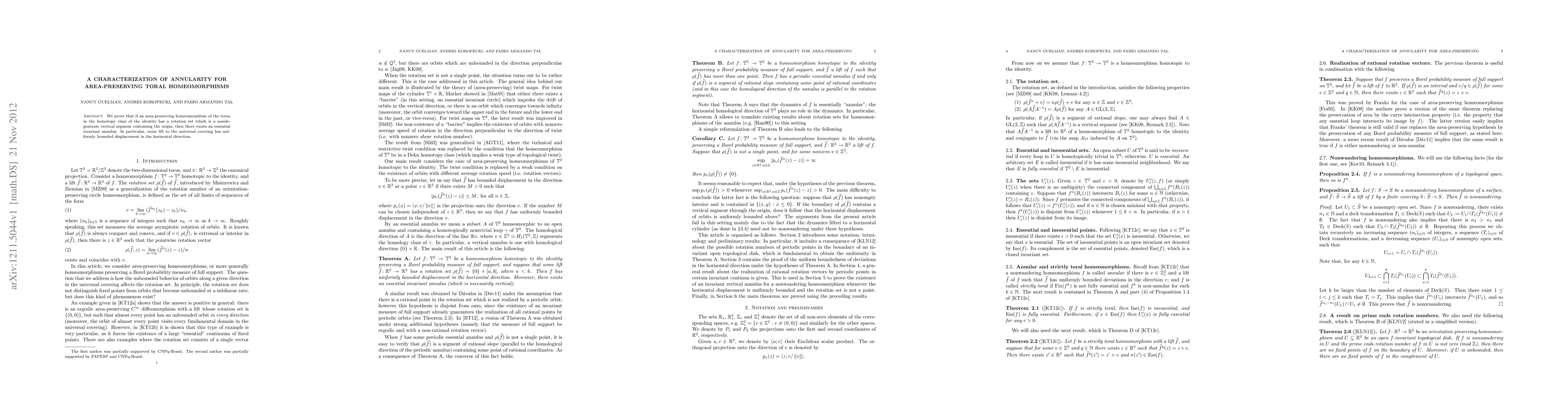 Summary: The paper demonstrates that area-preserving homeomorphisms of the torus with a specific rotation set structure imply the existence of an invariant annulus, with lifts showing uniform horizontal displacement bounds. This characterizes annularity for such homeomorphisms.