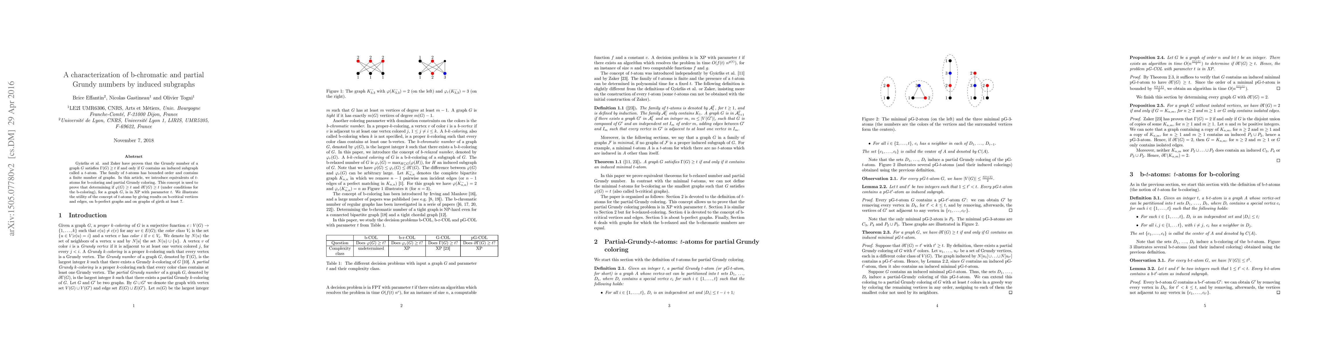 Gy{\'a}rf{\'a}s et al. and Zaker have proven that the Grundy number of a graph $G$ satisfies $\Gamma(G)\ge t$ if and only if $G$ contains an induced subgraph called a $t$-atom.The family of $t$-atoms has bounded order and contains a finite number of graphs.In this article, we introduce equivalents of $t$-atoms for b-coloring and partial Grundy coloring.This concept is used to prove that determining if $\varphi(G)\ge t$ and $\partial\Gamma(G)\ge t$ (under conditions for the b-coloring), for a graph $G$, is in XP with parameter $t$.We illustrate the utility of the concept of $t$-atoms by giving results on b-critical vertices and edges, on b-perfect graphs and on graphs of girth at least $7$.