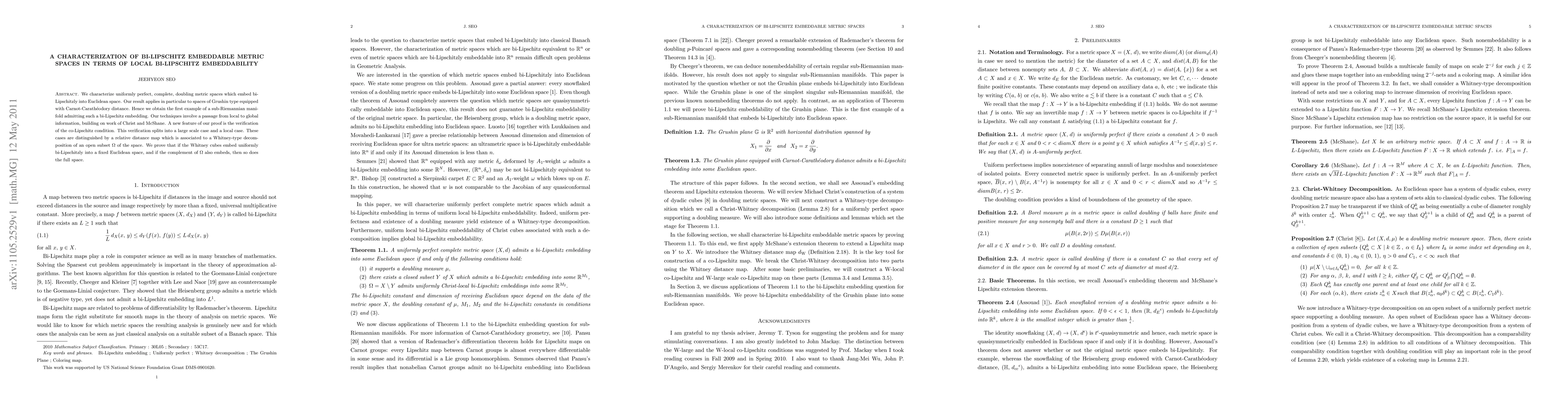 This paper characterizes uniformly perfect, complete, doubling metric spaces that can be bi-Lipschitz embedded into Euclidean space, applying specifically to Grushin type spaces with Carnot-Carathéodory distance. The authors introduce a new method to verify the co-Lipschitz condition, distinguishing between large-scale and local cases using a relative distance map and Whitney-type decomposition.