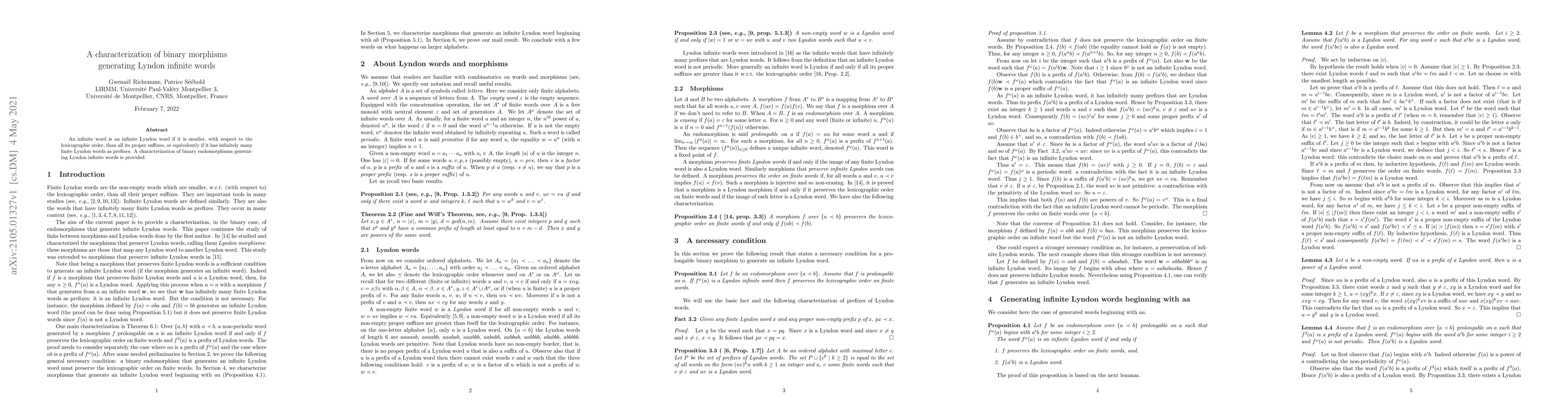 This paper characterizes binary endomorphisms that produce infinite Lyndon words, defining such words as those smaller than all their proper suffixes and having infinitely many finite Lyndon words as prefixes. The study explores the properties of these endomorphisms that ensure the generation of these specific infinite words.
