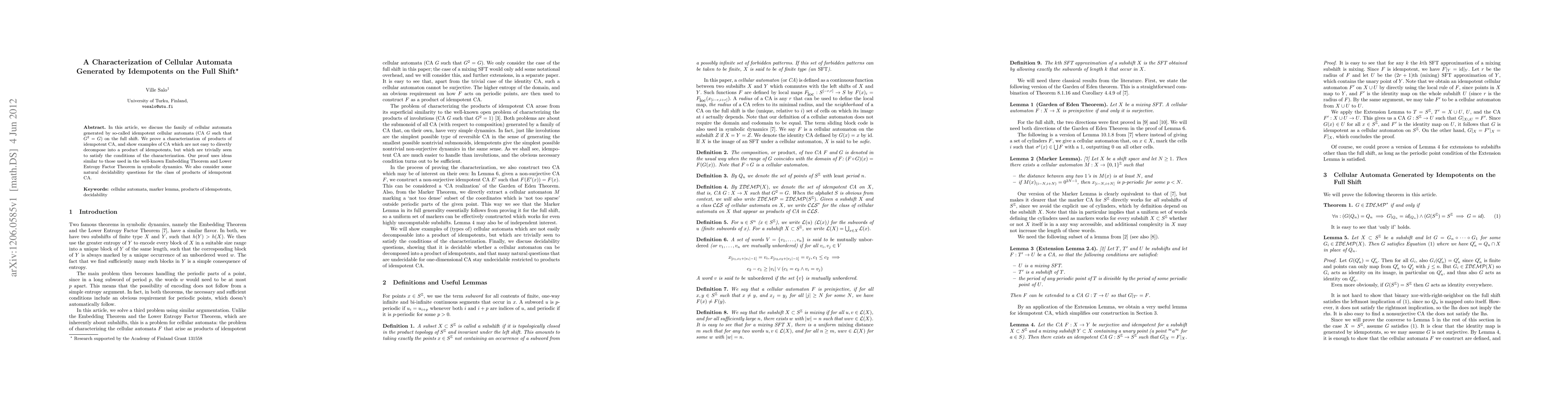 Researchers studied cellular automata generated by idempotent rules on the full shift, proving a characterization of products of idempotent CA and exploring decidability questions for the class.