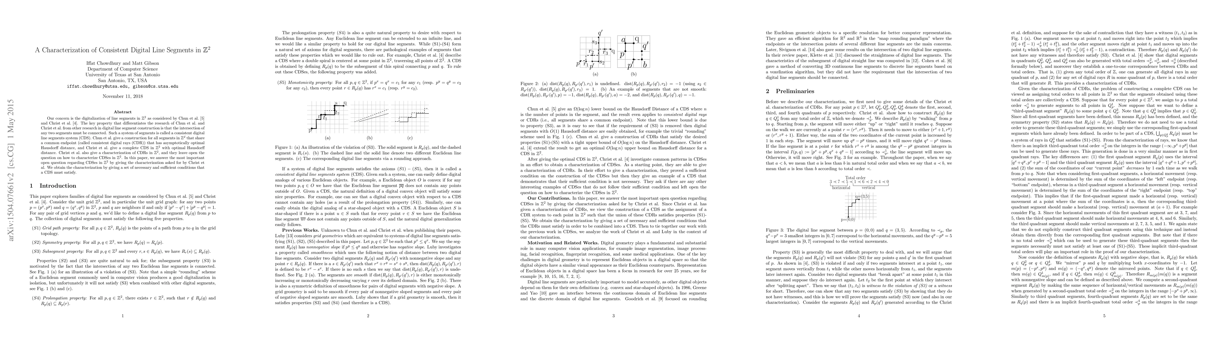 The paper characterizes Consistent Digital Line Segments (CDS) in two dimensions by providing necessary and sufficient conditions that a CDS must satisfy, addressing an open question left by Christ et al. (2012).
