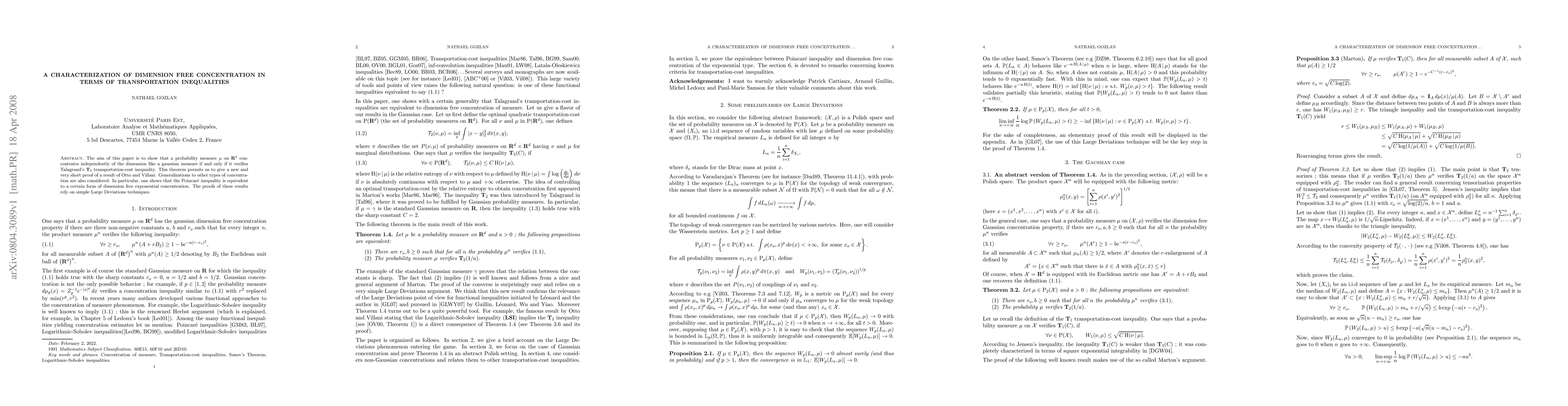 The aim of this paper is to show that a probability measure concentrates independently of the dimension like a gaussian measure if and only if it verifies Talagrand's $\T_2$ transportation-cost inequality. This theorem permits us to give a new and very short proof of a result of Otto and Villani. Generalizations to other types of concentration are also considered. In particular, one shows that the Poincar\'e inequality is equivalent to a certain form of dimension free exponential concentration. The proofs of these results rely on simple Large Deviations techniques.
