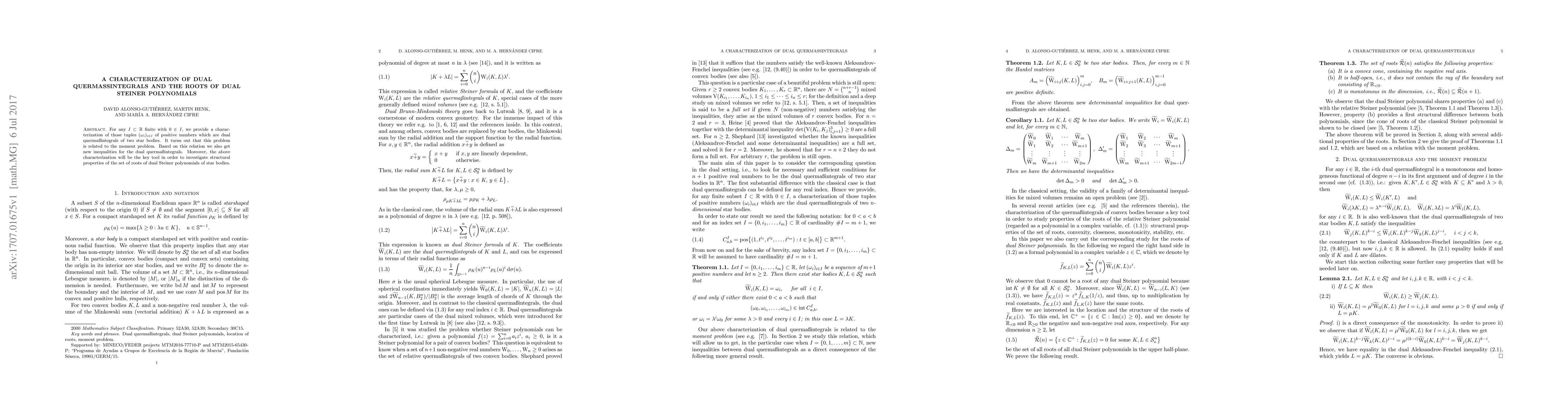 For any $I\subset\mathbb{R}$ finite with $0\in I$, we provide a characterization of those tuples $(\omega_i)_{i\in I}$ of positive numbers which are dual querma\ss integrals of two star bodies. It turns out that this problem is related to the moment problem. Based on this relation we also get new inequalities for the dual querma\ss integrals. Moreover, the above characterization will be the key tool in order to investigate structural properties of the set of roots of dual Steiner polynomials of star bodies.