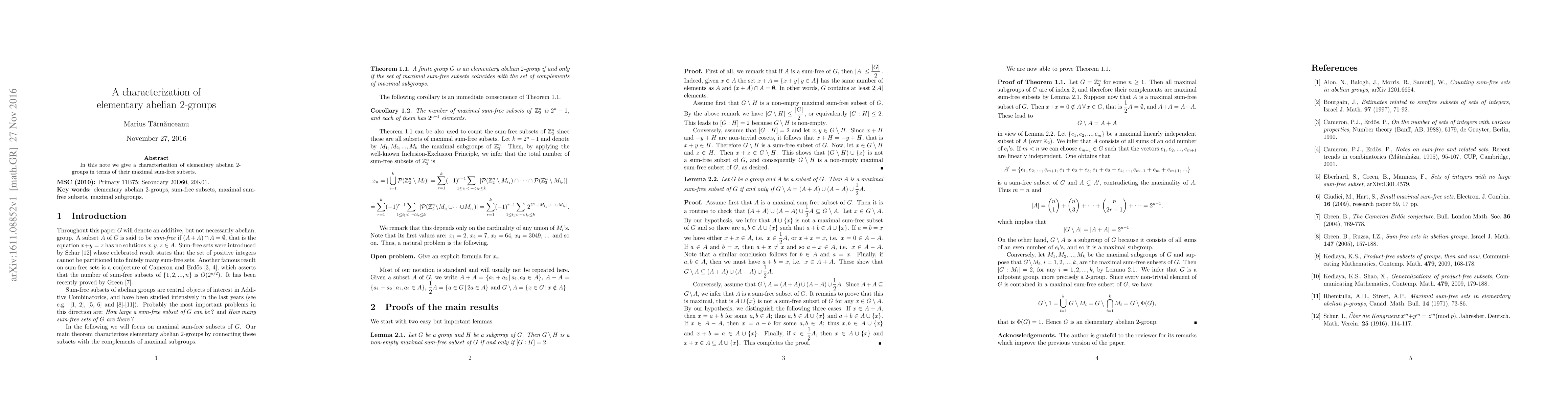 In this note we give a characterization of elementary abelian 2-groups in terms of their maximal sum-free subsets.