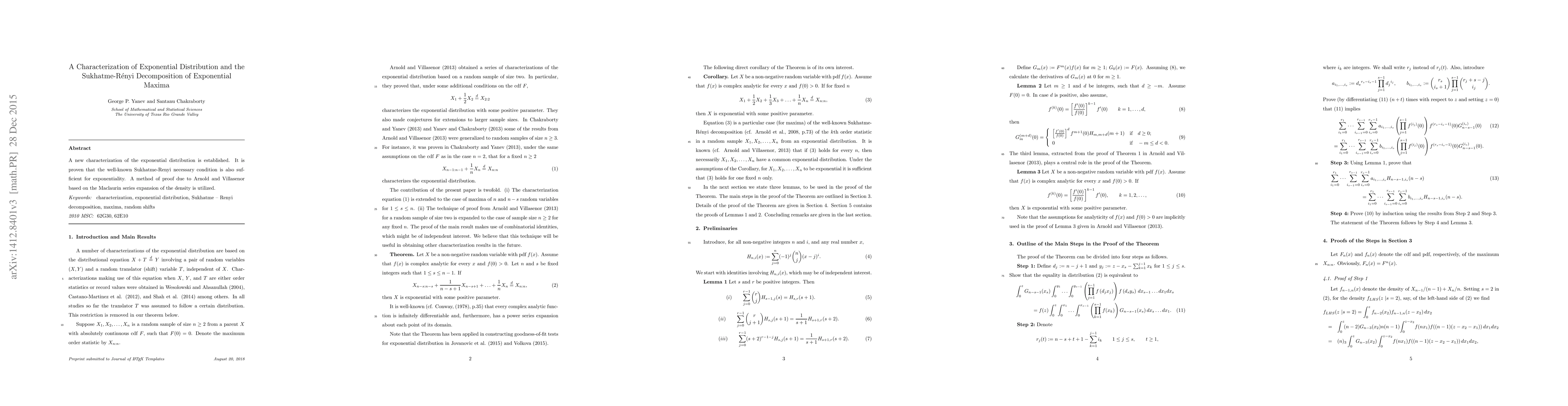 A new characterization of the exponential distribution is established. It is proven that the well-known Sukhatme-Renyi necessary condition is also sufficient for exponentiality. A method of proof due to Arnold and Villasenor based on the Maclaurin series expansion of the density is utilized.
