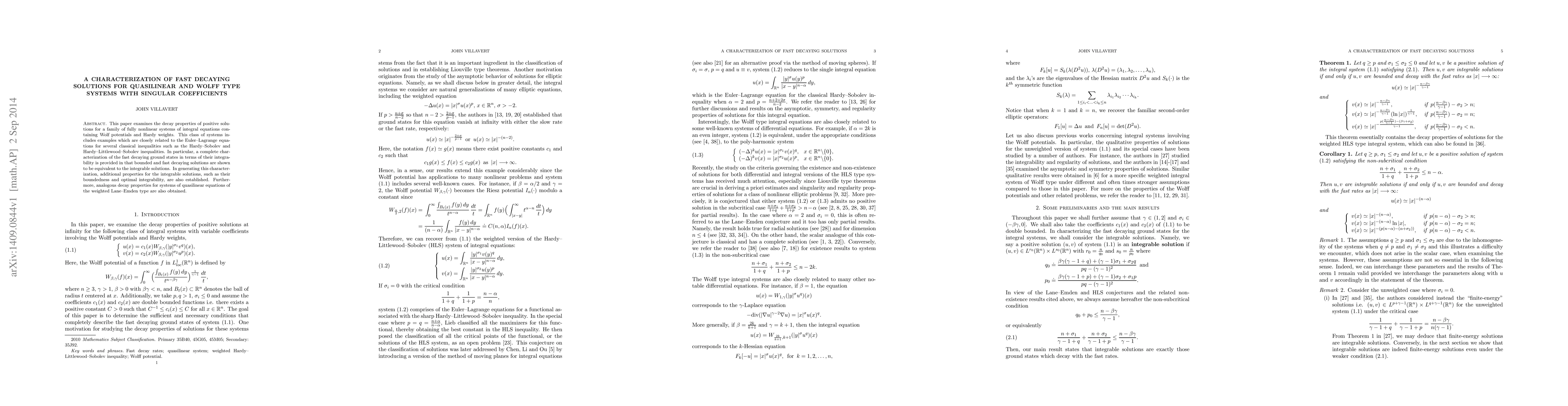 This paper characterizes fast-decaying solutions for quasilinear and Wolff type systems with singular coefficients, providing a key characterization of integrable solutions and establishing analogous decay properties for weighted Lane-Emden equations.