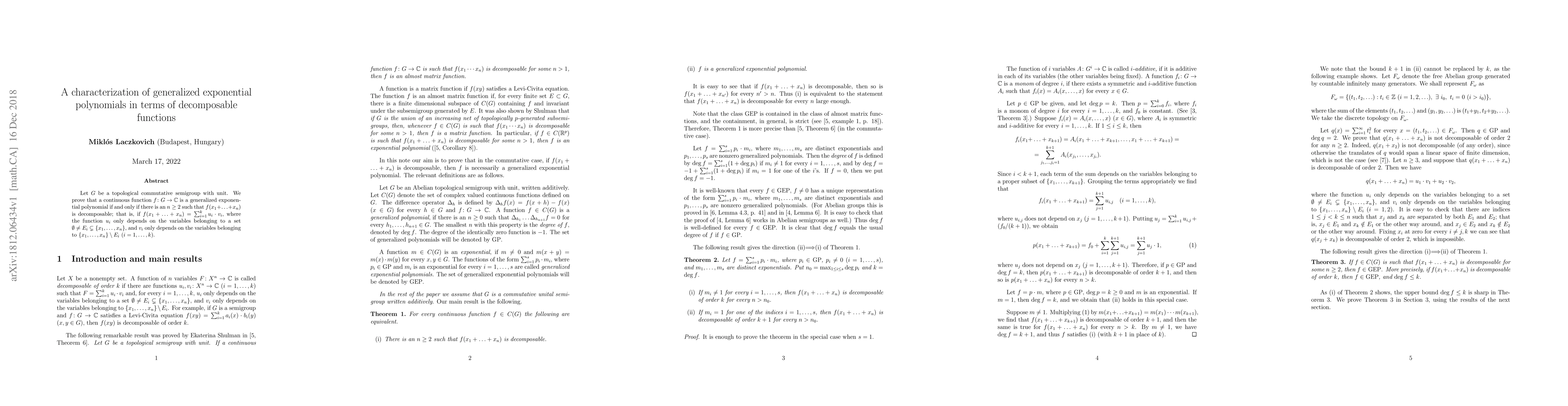 Let $G$ be a topological commutative semigroup with unit. We prove that a continuous function $f\colon G\to \cc$ is a generalized exponential polynomial if and only if there is an $n\ge 2$ such that $f(x_1 +\ldots +x_n )$ is decomposable; that is, if $f(x_1 +\ldots +x_n )=\sumik u_i \cd v_i$, where the function $u_i$ only depends on the variables belonging to a set $\emp \ne E_i \subsetneq \{ x_1 \stb x_n \}$, and $v_i$ only depends on the variables belonging to $\{ x_1 \stb x_n \} \se E_i$ $(i=1\stb k)$.