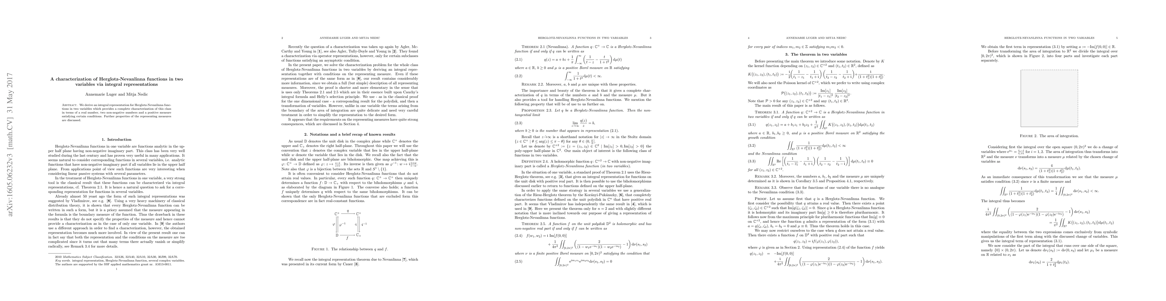 Summary: This paper derives an integral representation for Herglotz-Nevanlinna functions in two variables, providing a complete characterization through a real number, two non-negative numbers, and a positive measure under specific conditions, along with a discussion on properties of the representing measures.