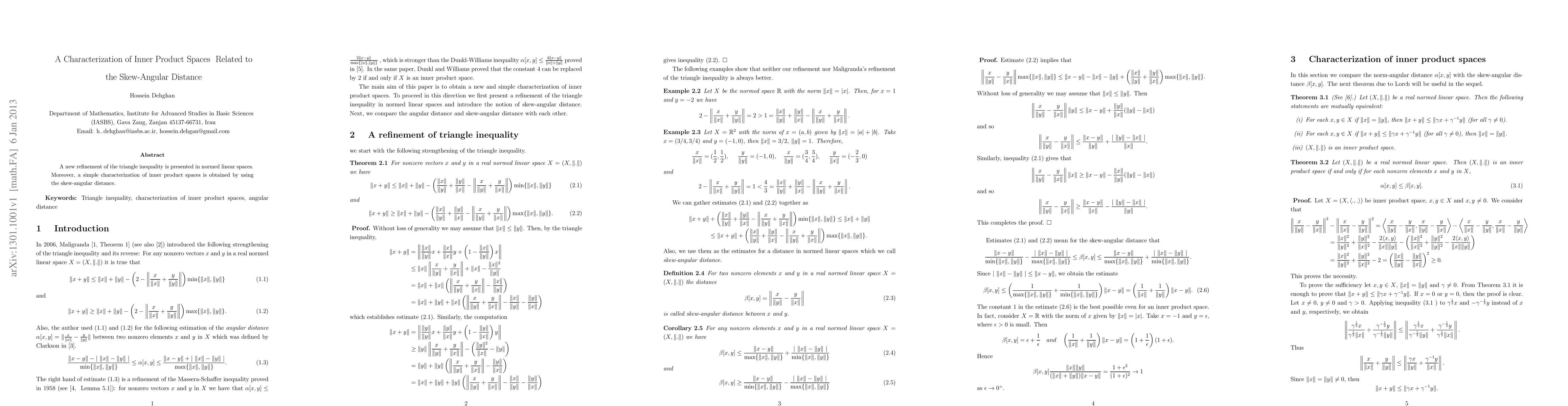 A new inequality is presented for normed linear spaces, and an inner product space characterization is obtained using skew-angular distance, offering a simple refinement of the triangle inequality.