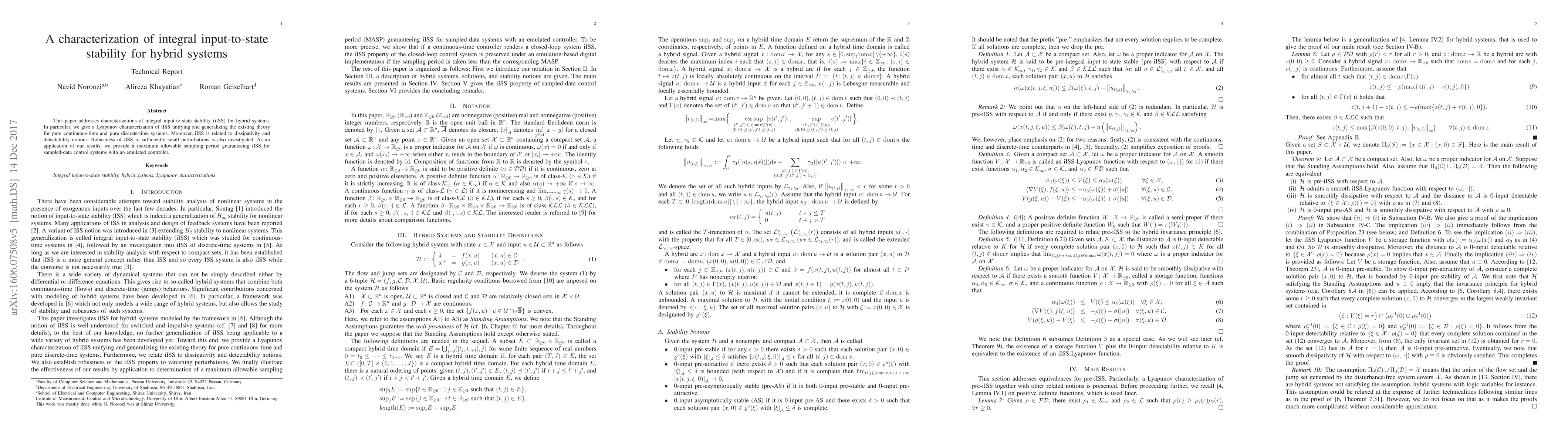 This paper provides a Lyapunov characterization of integral input-to-state stability (iISS) for hybrid systems, unifying existing theories for continuous and discrete systems, and explores its robustness to small perturbations. It also determines a maximum sampling period for sampled-data control systems to maintain iISS.