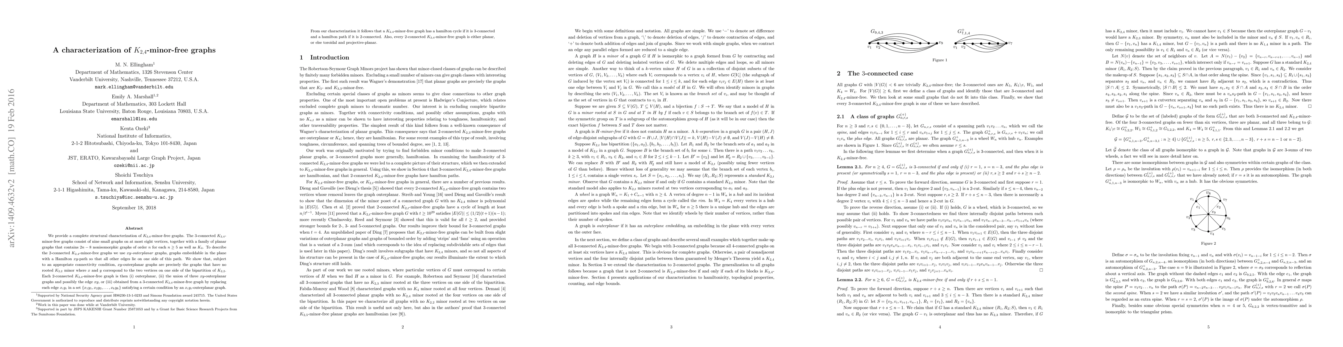 The paper provides a complete structural characterization of $K_{2,4}$-minor-free graphs, detailing 3-connected and 2-connected cases through various graph classes and minor conditions.