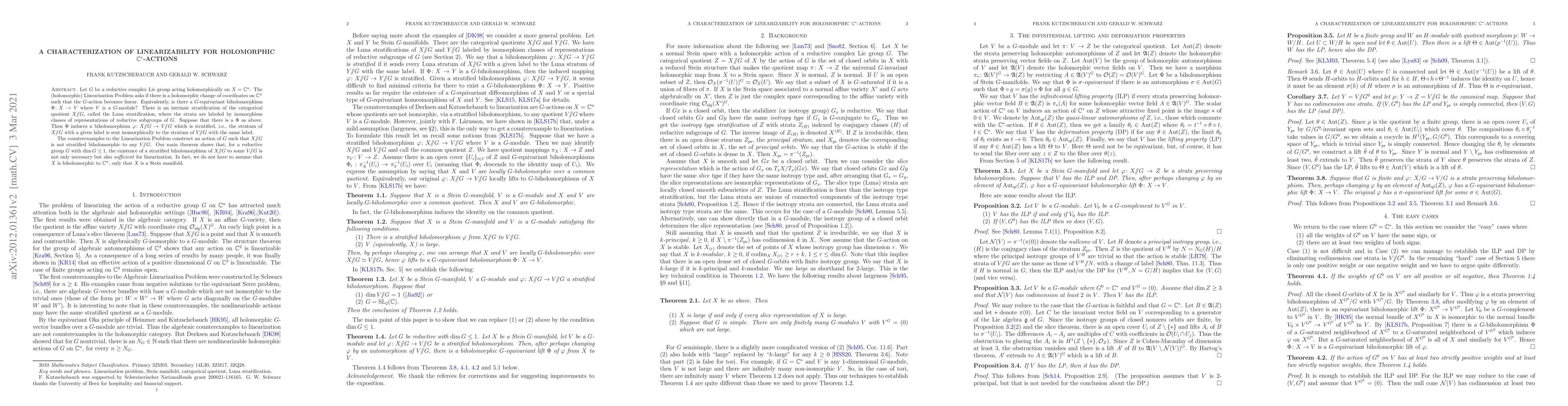 Let $G$ be a reductive complex Lie group acting holomorphically on $X=\mathbb{C}^n$. The (holomorphic) Linearization Problem asks if there is a holomorphic change of coordinates on $\mathbb{C}^n$ such that the $G$-action becomes linear. Equivalently, is there a $G$-equivariant biholomorphism $\Phi \colon X\to V$ where $V$ is a $G$-module? There is an intrinsic stratification of the categorical quotient $X /\!/G$, called the Luna stratification, where the strata are labeled by isomorphism classes of representations of reductive subgroups of $G$. Suppose that there is a $\Phi$ as above. Then $\Phi$ induces a biholomorphism $\phi\colon X/\!/G\to V/\!/G$ which is stratified, i.e., the stratum of $ X/\!/G$ with a given label is sent isomorphically to the stratum of $V/\!/G$ with the same label. The counterexamples to the Linearization Problem construct an action of $G$ such that $X/\!/G$ is not stratified biholomorphic to any $V/\!/G$. Our main theorem shows that, for a reductive group $G$ with $G^0=\mathbb{C}^*$, the existence of a stratified biholomorphism of $X/\!/G$ to some $V/\!/G$ is not only necessary but also sufficient for linearization. In fact, we do not have to assume that $X$ is biholomorphic to $\mathbb{C}^n$, only that $X$ is a Stein manifold.