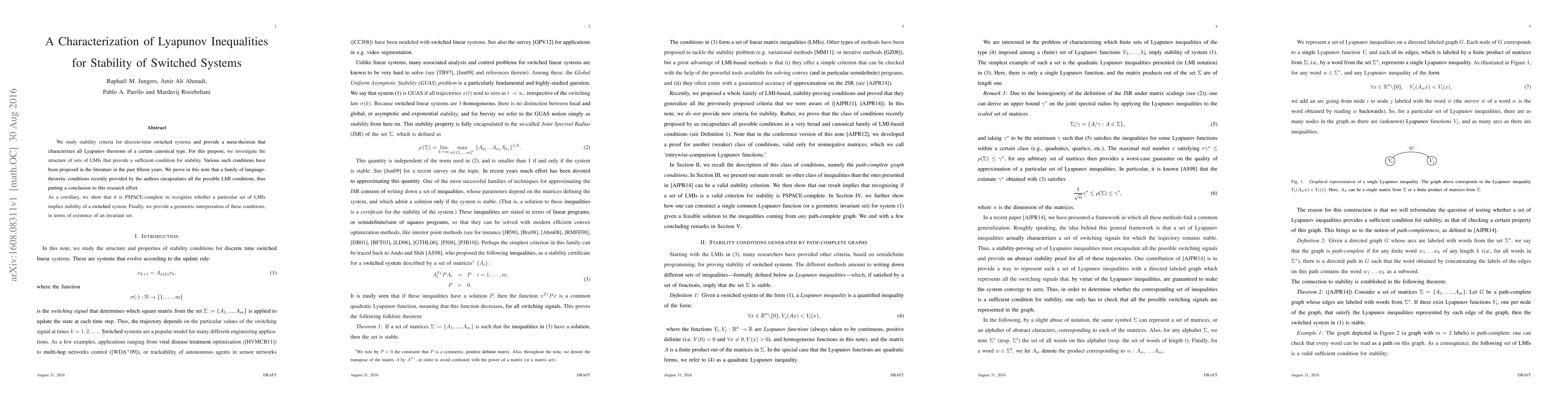 We study stability criteria for discrete-time switched systems and provide a meta-theorem that characterizes all Lyapunov theorems of a certain canonical type. For this purpose, we investigate the structure of sets of LMIs that provide a sufficient condition for stability. Various such conditions have been proposed in the literature in the past fifteen years. We prove in this note that a family of languagetheoretic conditions recently provided by the authors encapsulates all the possible LMI conditions, thus putting a conclusion to this research effort. As a corollary, we show that it is PSPACE-complete to recognize whether a particular set of LMIs implies stability of a switched system. Finally, we provide a geometric interpretation of these conditions, in terms of existence of an invariant set.